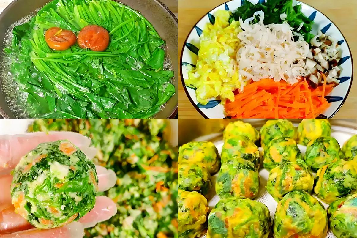 1. 菠菜、香菇、胡蘿蔔洗淨,焯水1分鐘後撈出擠幹水分,切碎。