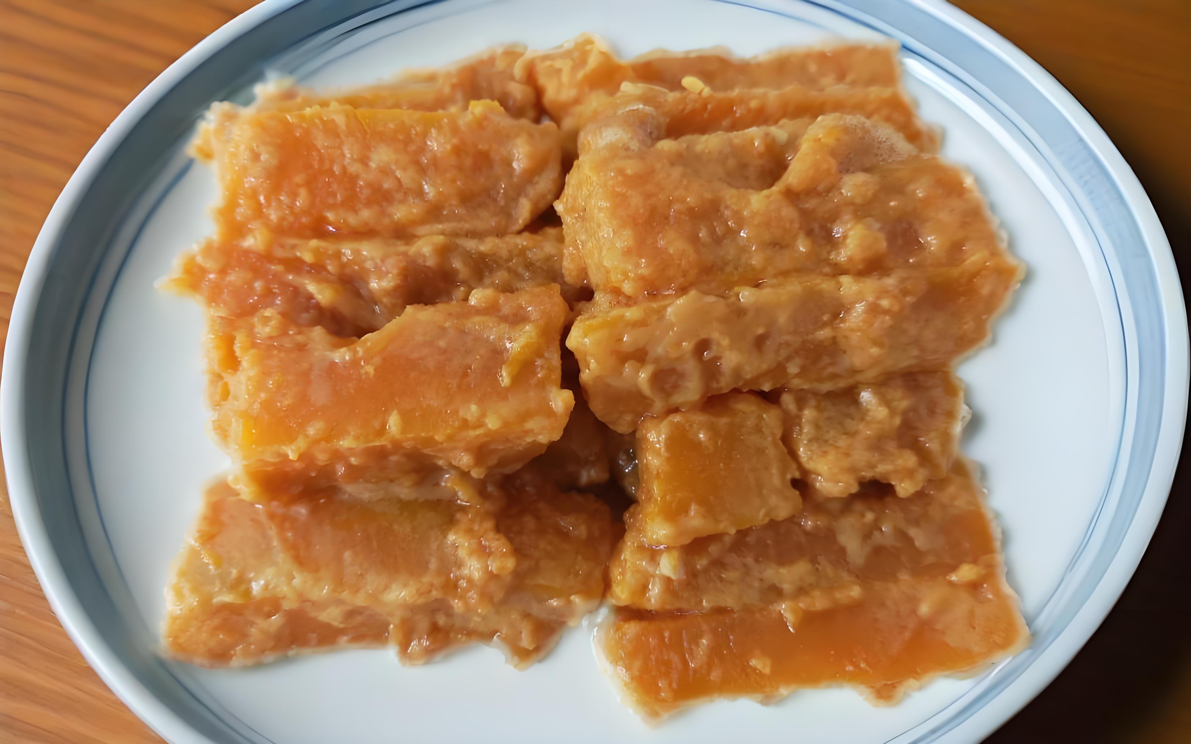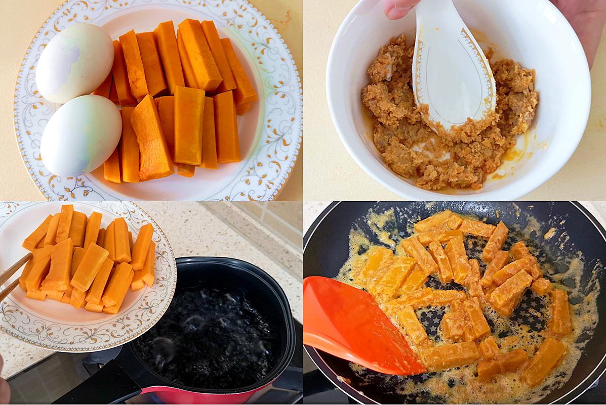 1. 南瓜去皮去瓤,切成長條。鹹鴨蛋黃蒸熟後壓碎。