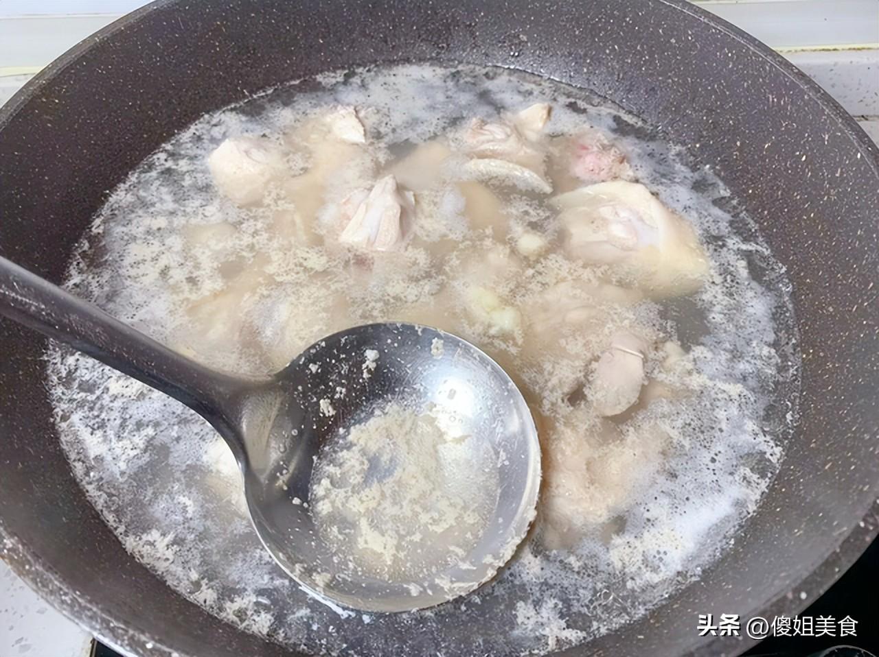 2、半隻雞斬成塊,冷水下鍋,一定要冷水下鍋,加入幾片姜和一兩勺料酒,開大火煮沸。水開後會浮起很多血沫,用勺子耐心地撇乾淨。這一步是爲了去掉雞肉的腥氣和多餘的血水,讓湯色更清亮,味道更純粹。焯好後的雞肉,用溫水沖洗乾淨,瀝乾備用。可別用冷水衝啊,熱肉遇冷,肉質容易變柴。