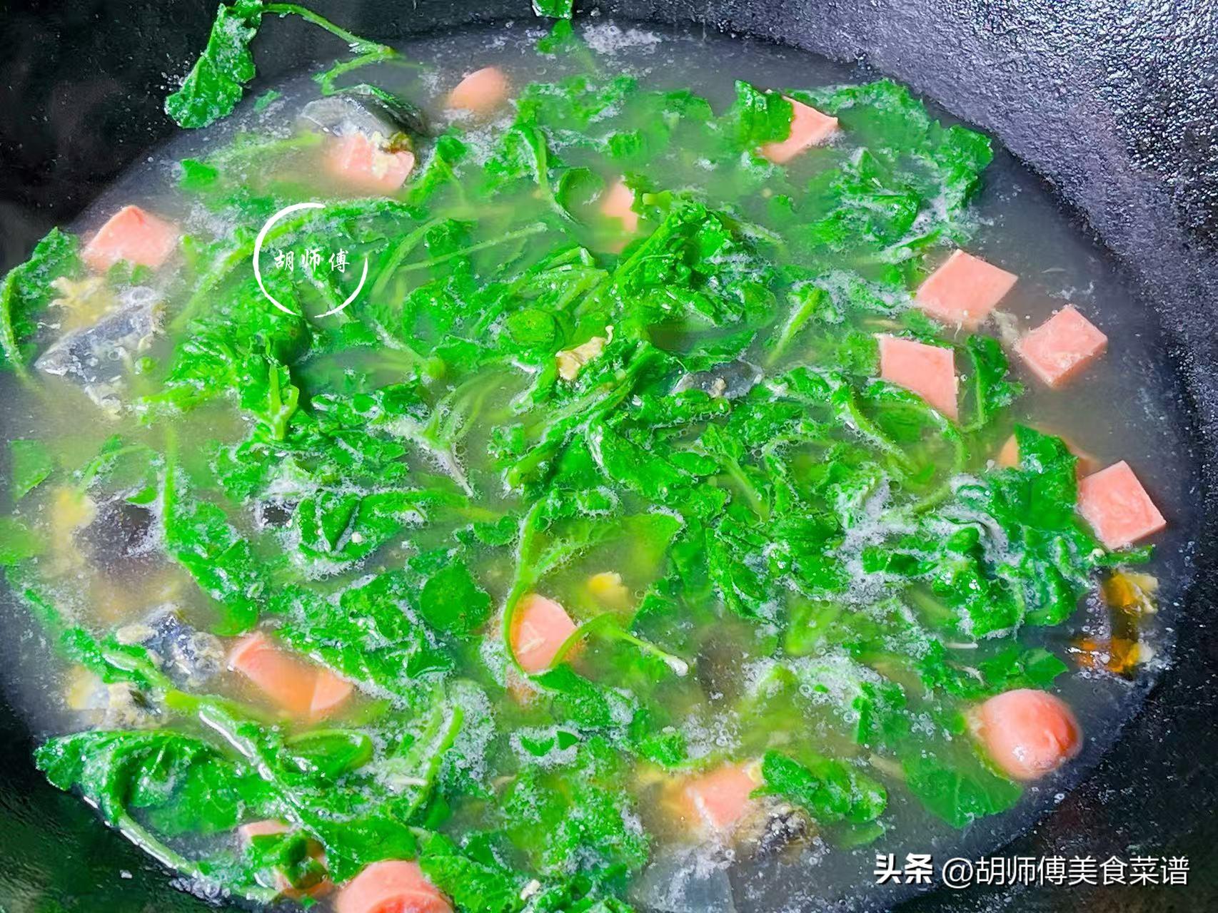 第三步:時間到後,再將蘿蔔苗、食鹽放入鍋中,將蘿蔔苗煮的斷生後,最後撒上一點點胡椒粉即可食用。