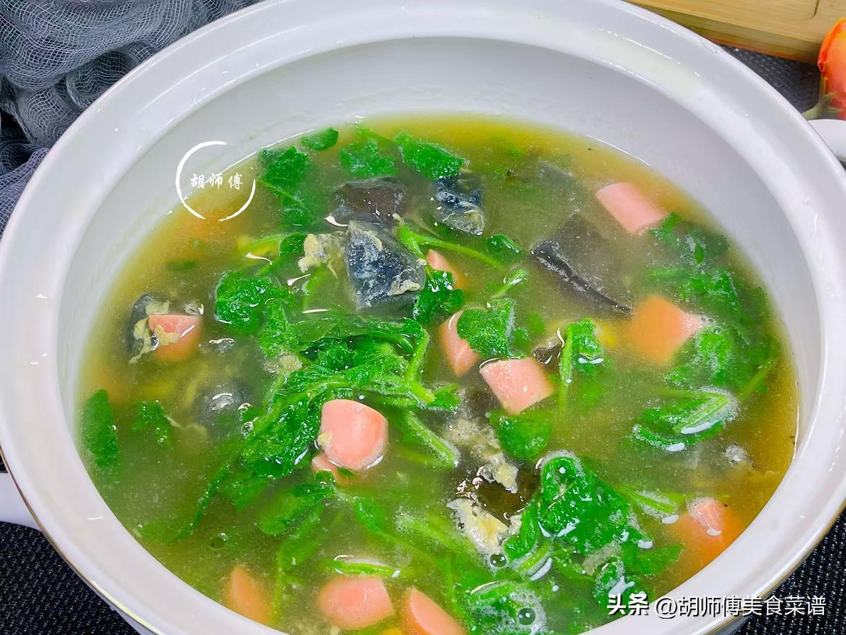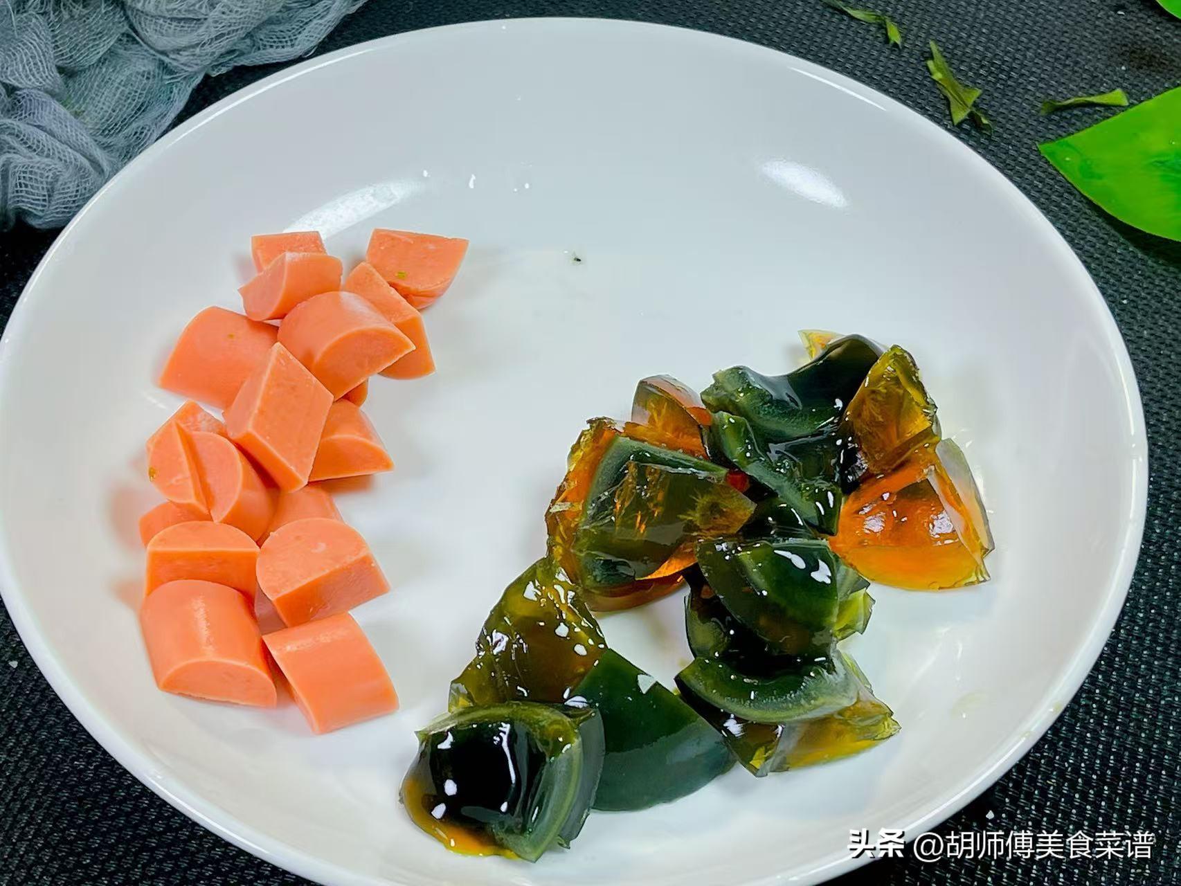 【食材準備】:蘿蔔苗200克、火腿腸2根、皮蛋2個、食鹽、胡椒粉、食用油適量。