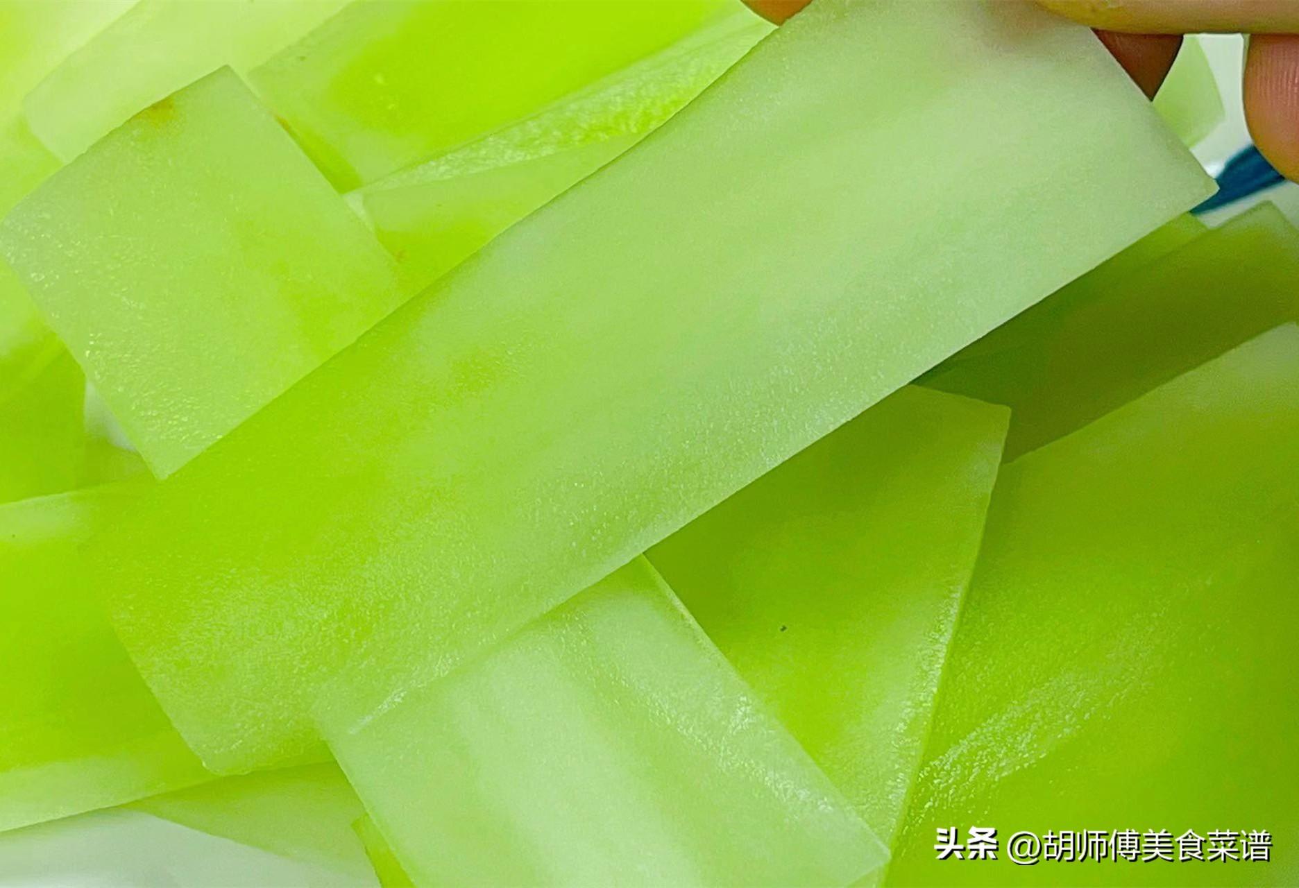 第一步:將萵筍皮削掉後,然後將萵筍沖洗乾淨,接着再把萵筍切成2釐米寬6-7釐米長的片狀備用。