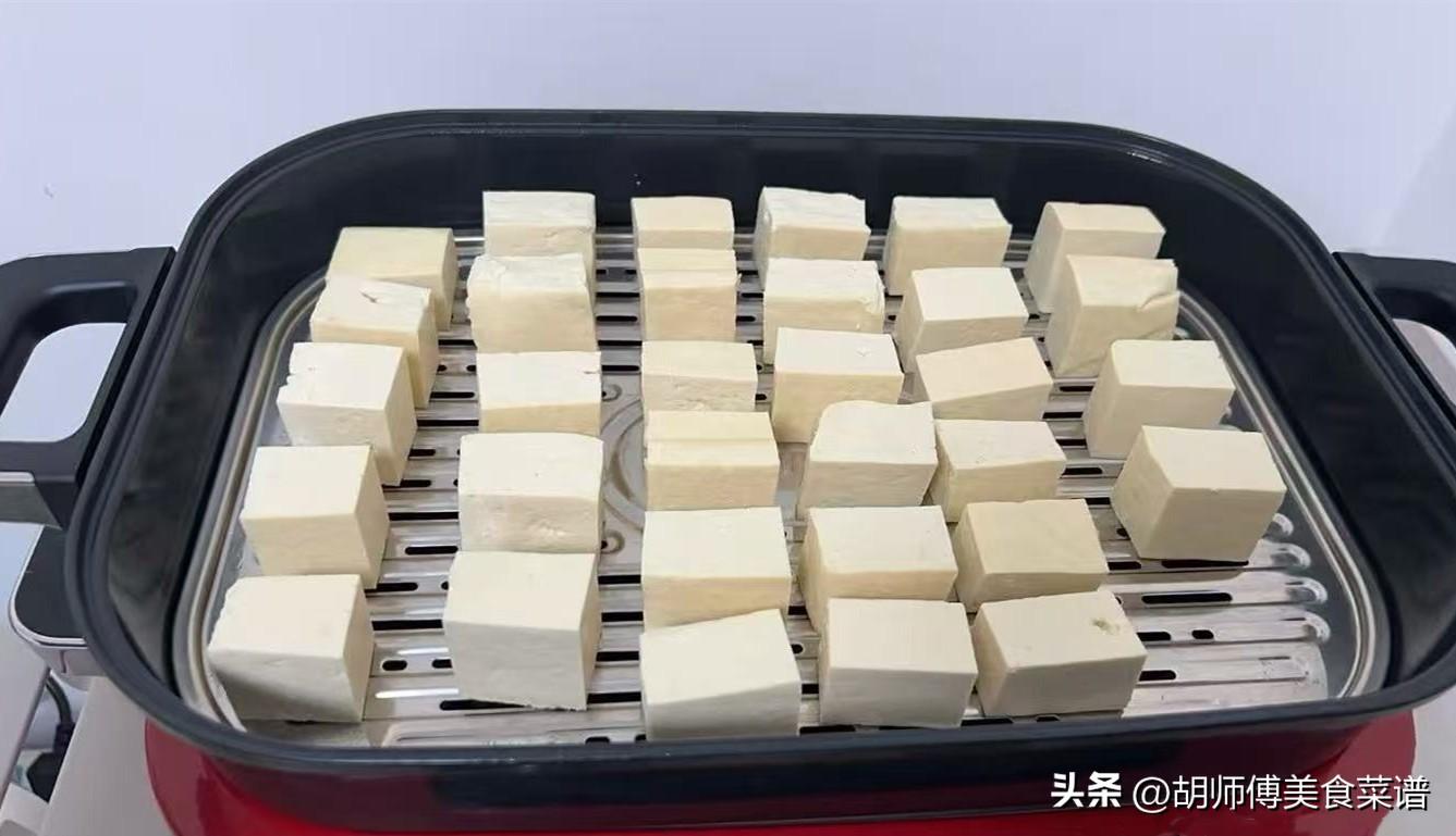 第一步:將老豆腐切成3釐米左右的正方形,然後把豆腐沖洗乾淨,接着將豆腐放入蒸鍋中蒸1分鐘,這樣可以殺死豆腐表面的有害菌。