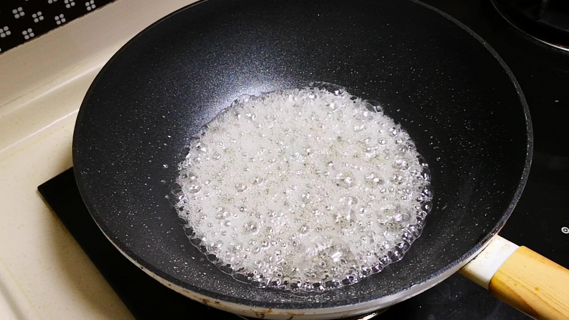4.起鍋加入冰糖和清水,用小火加熱,一邊煮一邊攪拌,直到冰糖完全融化,然後轉成中火。繼續煮至糖漿呈淺金黃色,用筷子蘸一點糖漿,放到冷水中能迅速凝固且脆硬,說明糖醬煮好了。
