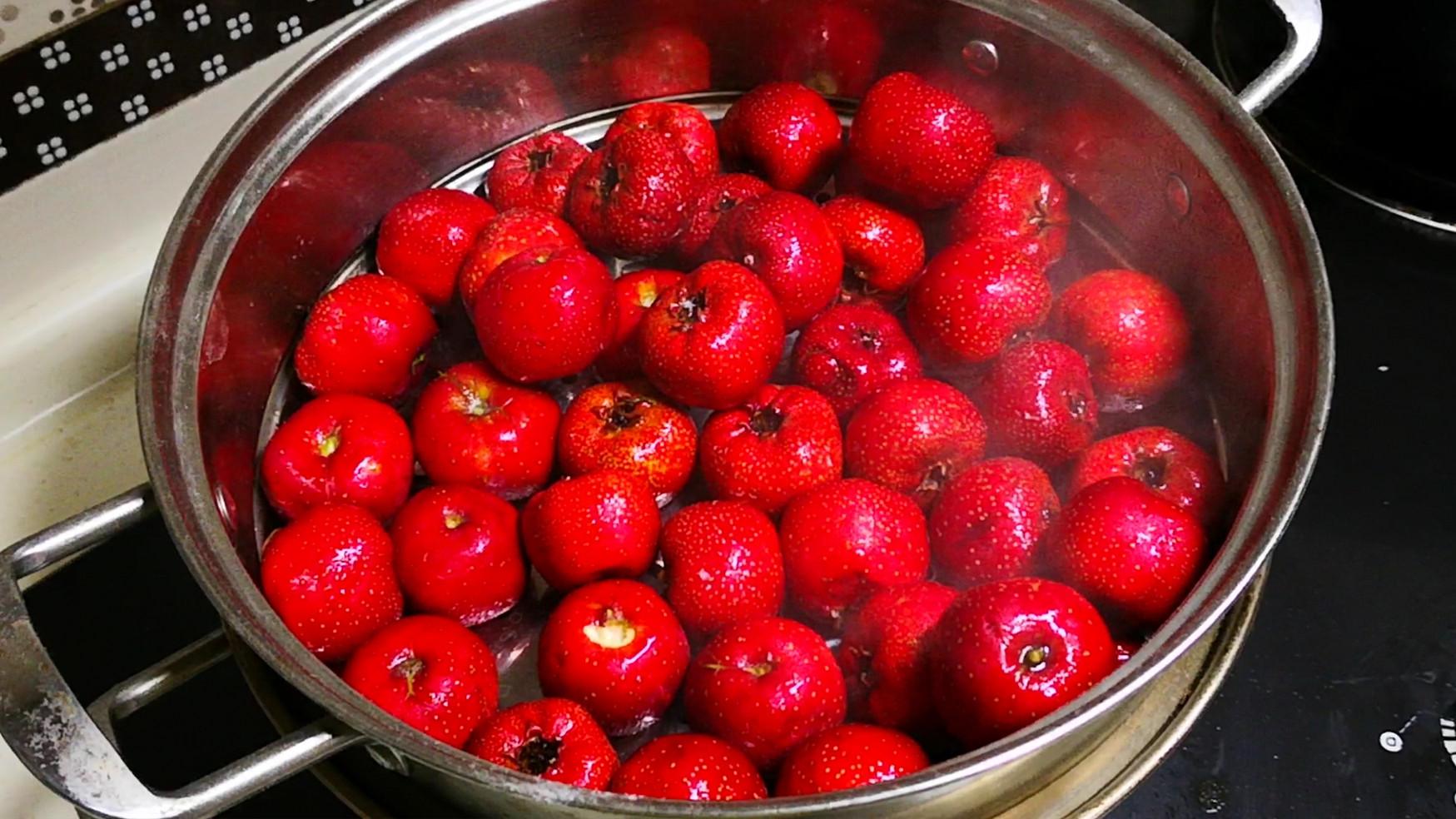 山楂可以洗乾淨了直接喫,酸甜開胃,不過有的朋友可能會覺得有點酸。所以,我一般都會把它這樣蒸一蒸,再下鍋滾一滾,軟糯香甜,老人和孩子都愛喫!