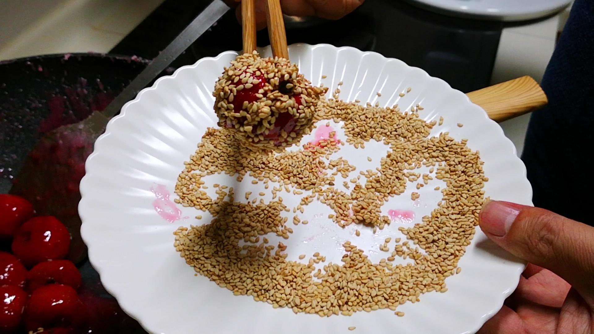 5.這時關火,將山楂快速倒入糖漿中,用鏟子不停地翻拌,讓山楂表面均勻地裹上糖漿。然後取出山楂放到裝有芝麻的盤裏滾一滾,讓芝麻粘在糖漿的表面。
