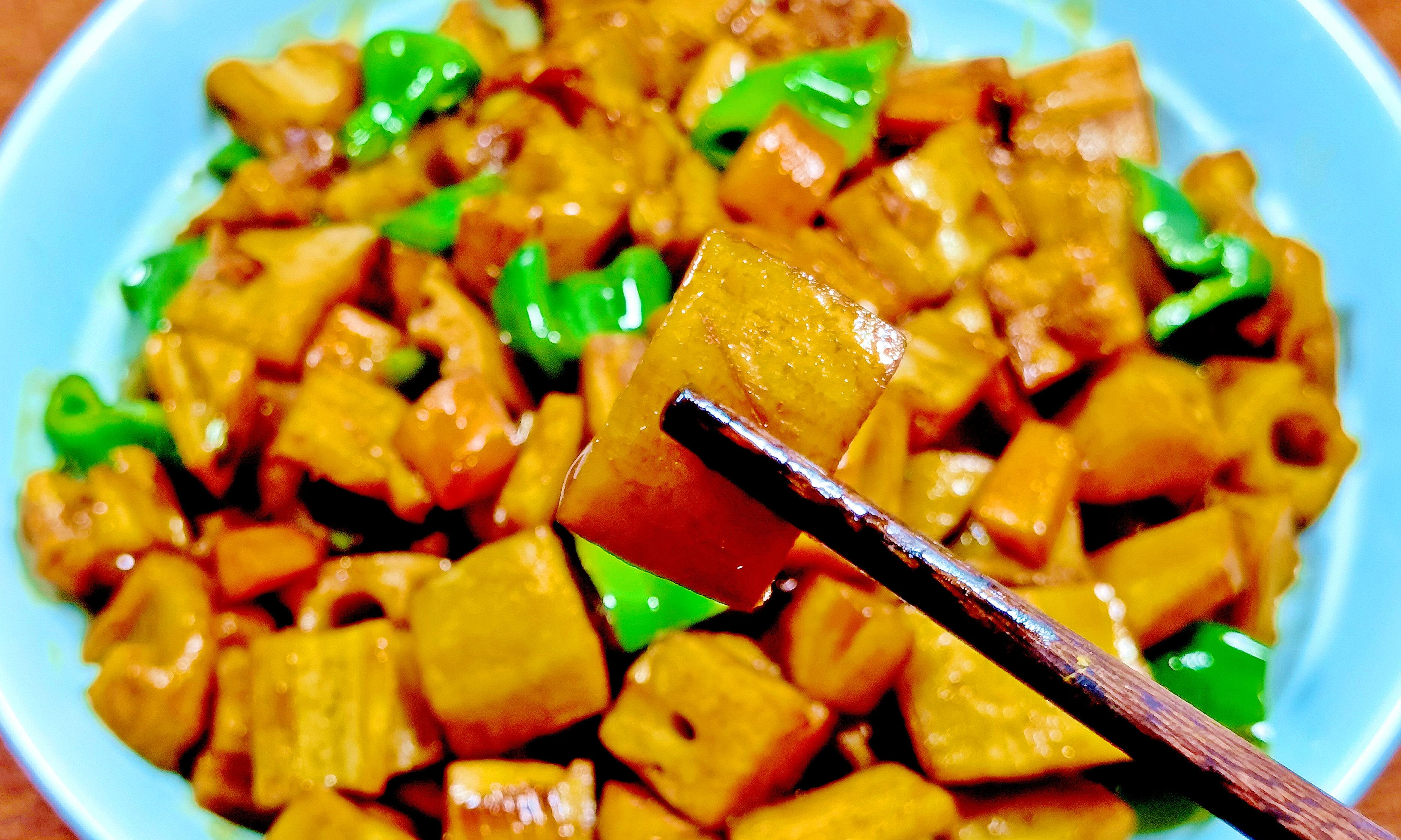 這道素炒菜色彩豔麗,口感豐富,糖醋口味特別開胃。蓮藕生津健脾,胡蘿蔔補肝明目,青椒富含維C,搭配在一起既美味又養生。