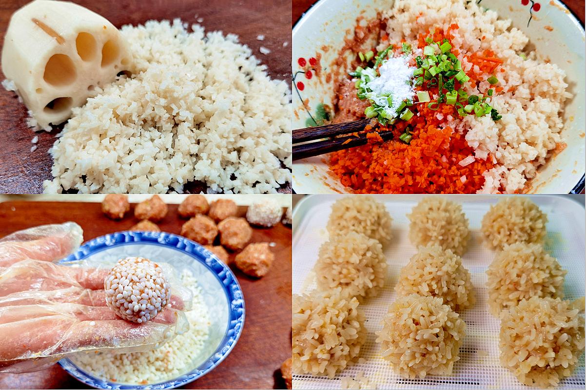 食材:蓮藕1節、豬肉餡200g、胡蘿蔔半根、糯米半碗、蔥花、生抽、鹽