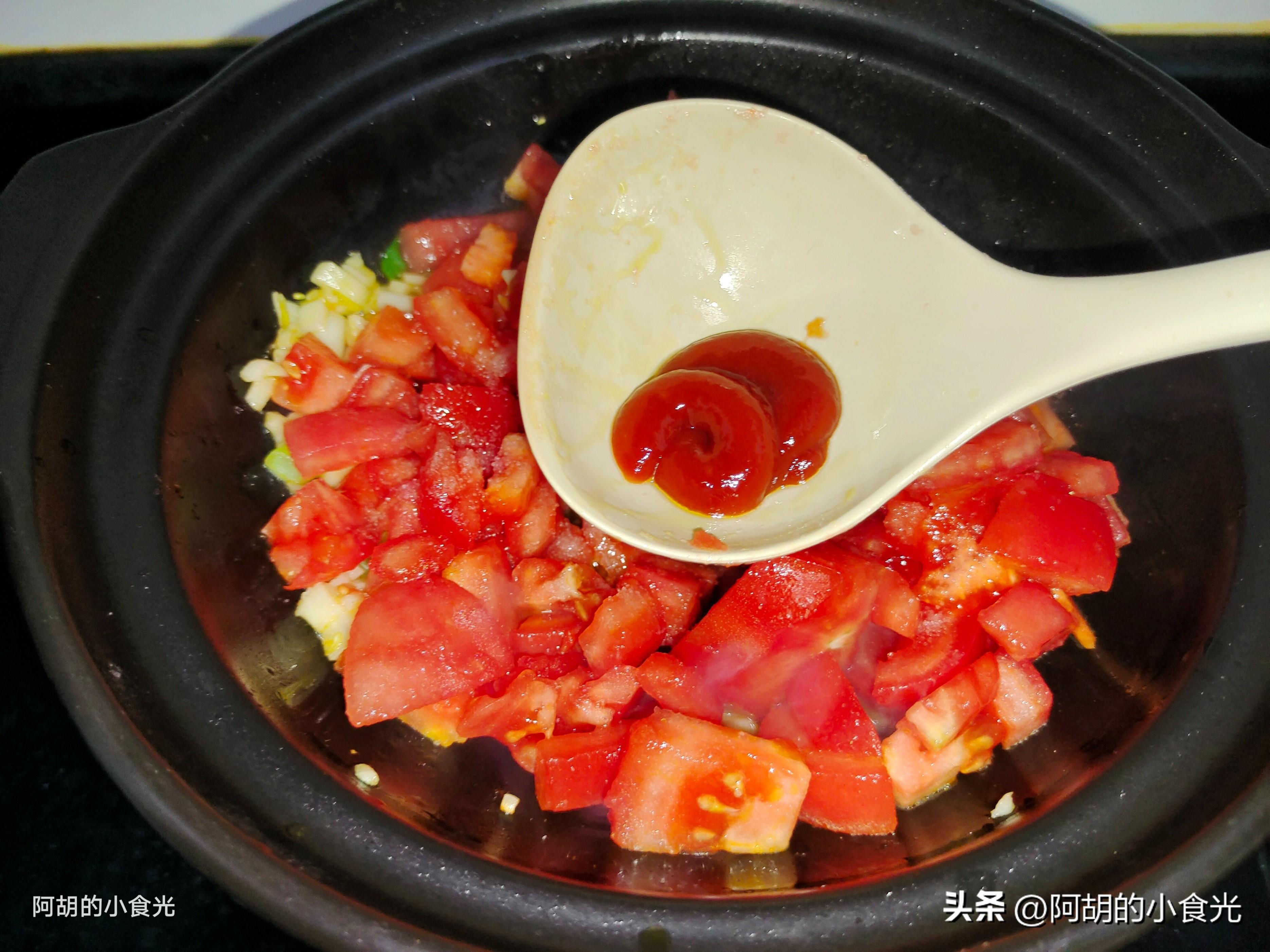 第四步:此時準備一口砂鍋,置於竈火上燒熱,淋入一些花生油燒熱,來一些小料蔥蒜末炒出香味,接着把去皮切丁的西紅柿下鍋炒一炒,炒的時候可以撒入一些食鹽促進其滲出湯汁,還可以加入一些番茄醬或者番茄沙司一塊炒一炒增加風味,炒出足量的湯汁後就把切塊的西紅柿也下鍋,淋入一圈生抽炒勻。