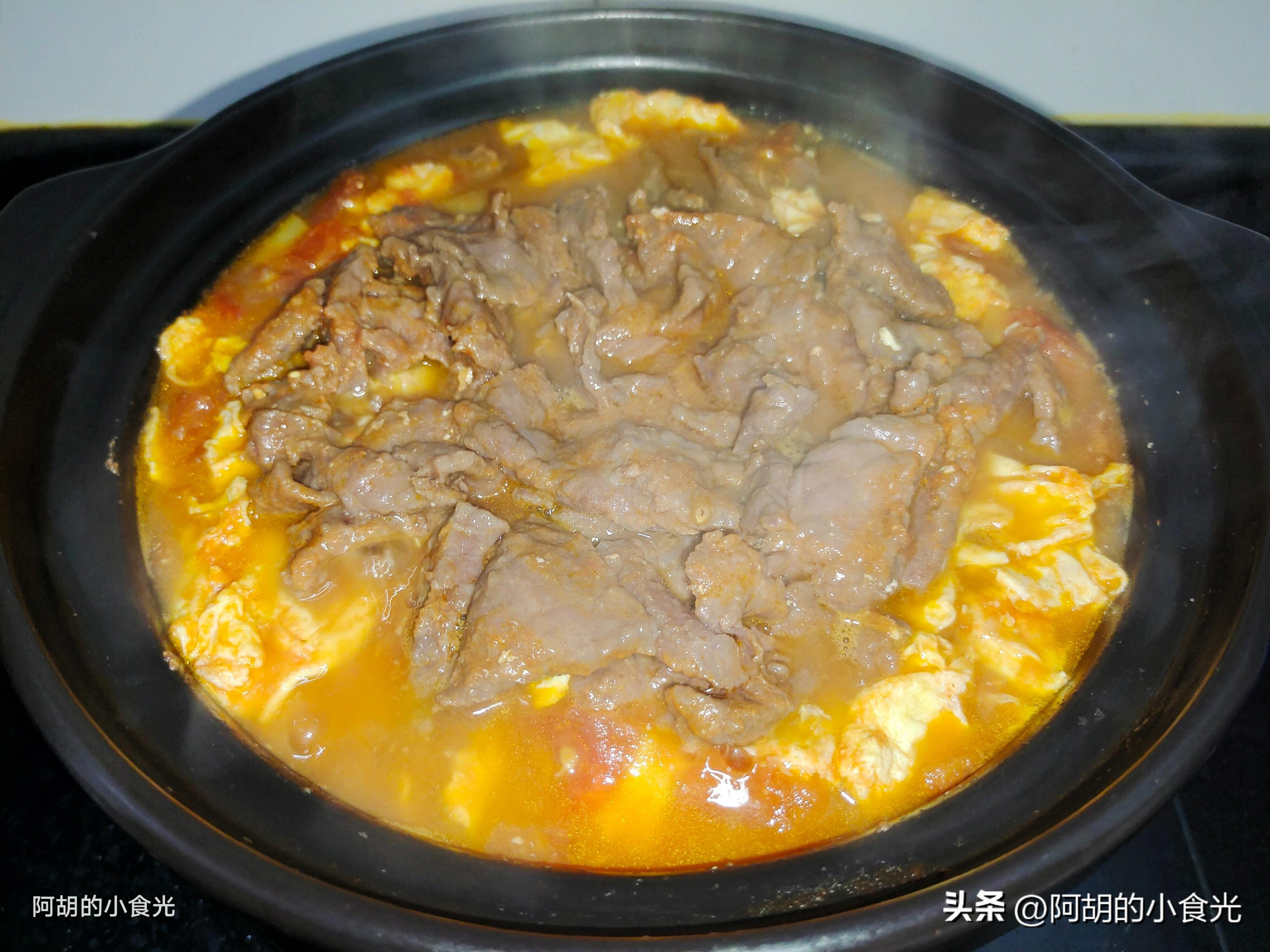 第六步:最後取出醃製好的牛肉片直接鋪在最上面,整理好後加蓋燜煮七八分鐘時間。牛肉完全熟透後撒入一把蔥花就可以上桌開喫了。牛肉、西紅柿和雞蛋的完美搭配,既美味又有好營養,深得家中小朋友的喜愛,開胃下飯值得試一試。