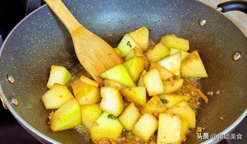 2、鍋裏放少許油,放入肉沫,小火慢慢煸炒,看着肉沫從粉白色變成淺棕色,放入蔥姜爆香,香味瞬間被激發出來,然後放入切好的冬瓜塊,翻炒幾下,加入適量生抽,炒出醬香味,這時候倒入足夠的開水,水量要能沒過冬瓜,大火燒開後轉中小火,慢慢燉煮。