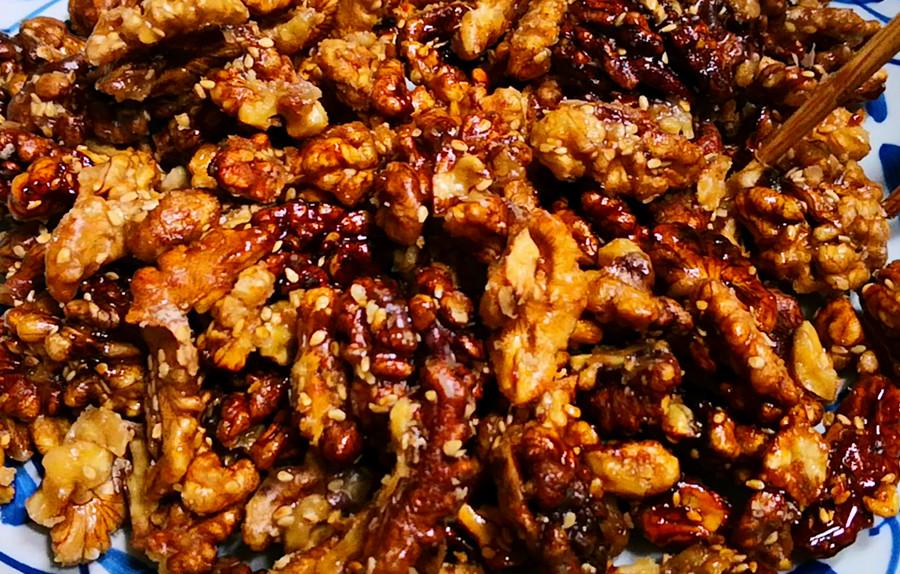 琥珀核桃做法也是十分的簡單,首先準備適量的核桃仁、白糖、蜂蜜和水。將核桃放入開水中焯一下,去除表面的澀味,然後撈出瀝乾水分。接着,在鍋中加入適量的水和白糖,小火煮至白糖融化,形成糖漿。再將核桃放入糖漿中,翻炒均勻,讓每一顆核桃都裹上糖漿。最後,加入適量的蜂蜜,繼續翻炒,直到糖漿變得濃稠,核桃表面形成一層晶瑩的糖衣。將炒好的琥珀核桃放在盤子裏晾涼,美味就大功告成啦!