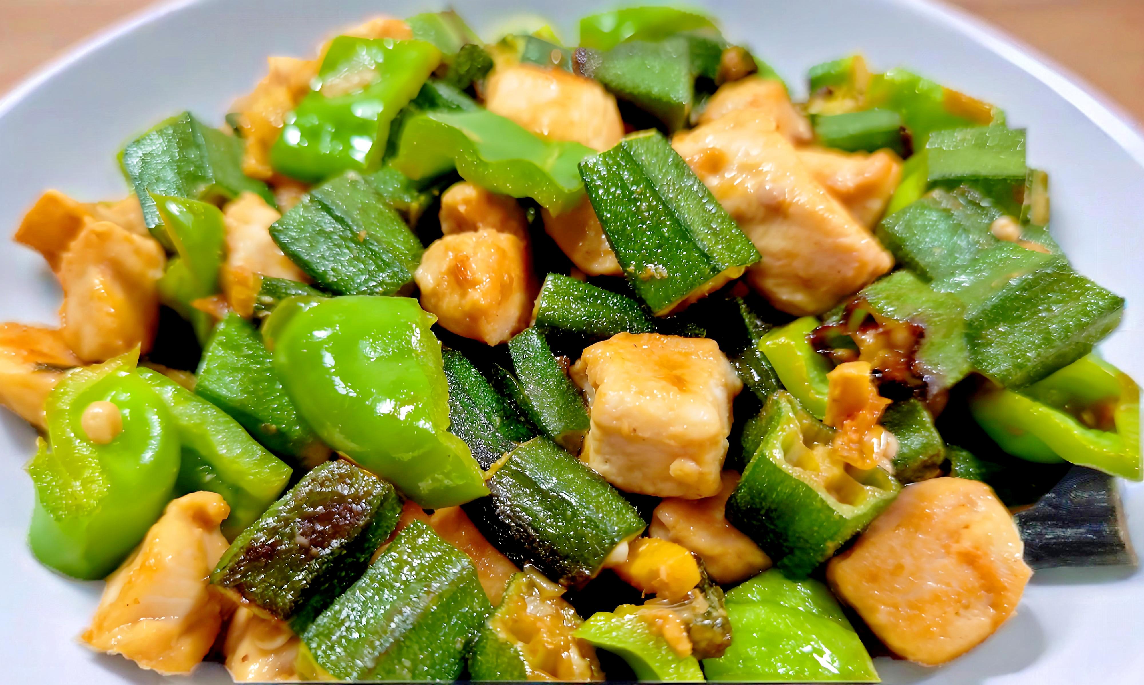 1. 準備:秋葵洗淨,焯水一分鐘後撈出,切成小段;雞胸肉切丁,用少許料酒、生抽、澱粉抓勻醃製;青椒切塊。