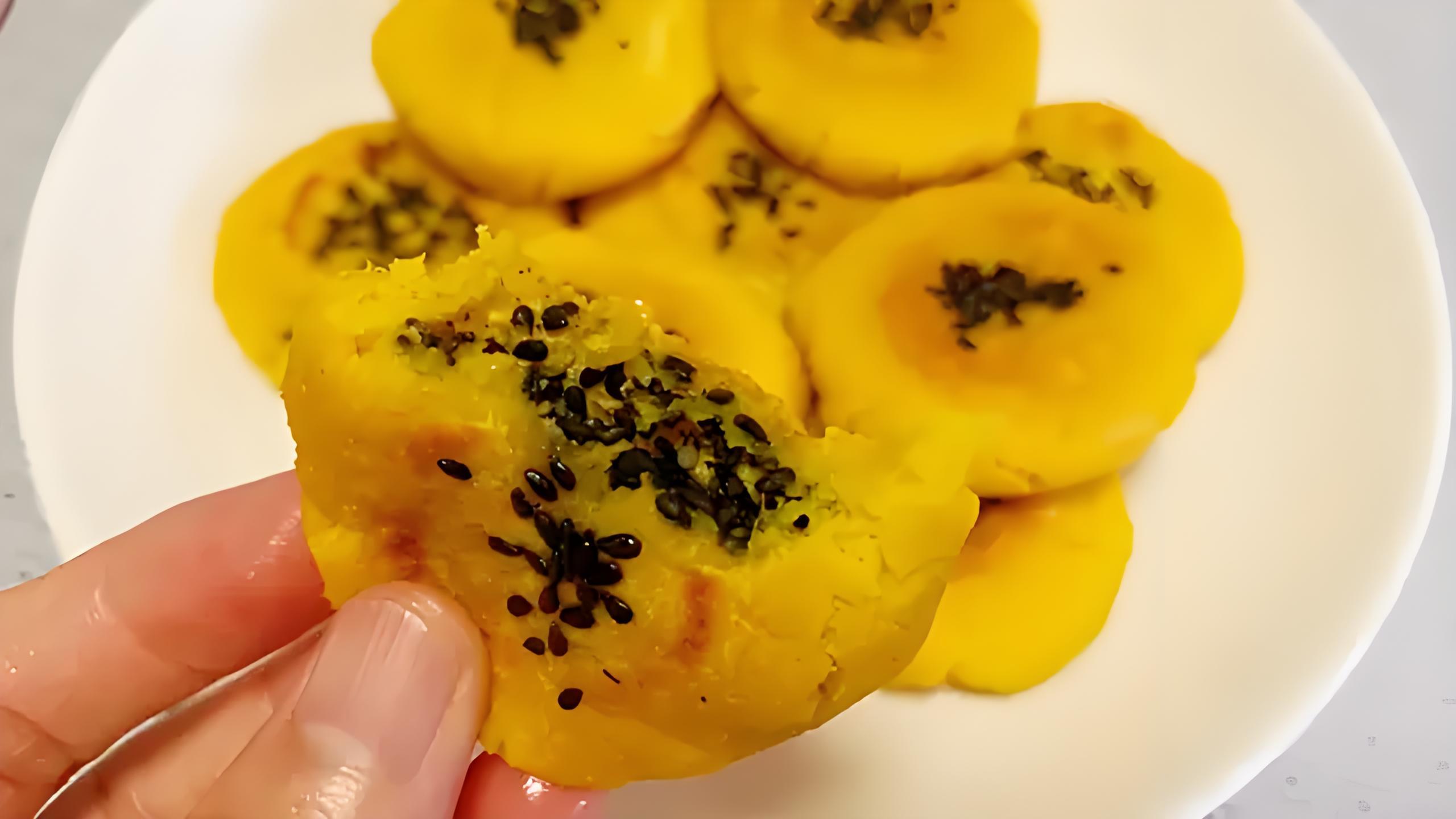 4. 煎制:平底鍋刷一層薄油,放入南瓜餅,開小火慢煎。煎到一面定型金黃後,翻面,煎至兩面金黃,餅身微微鼓起就是熟了。