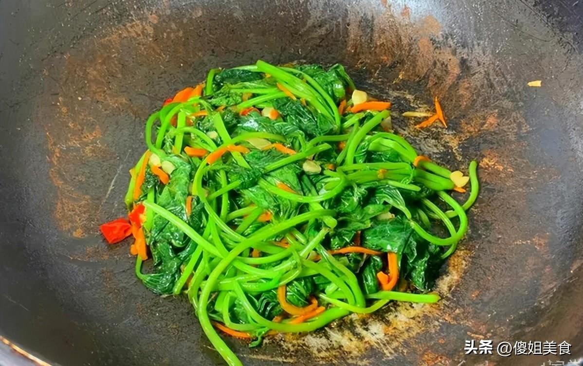 鍋裏放入一勺豬油,這可是這道菜的靈魂所在,等油熱了,先下蒜末和小米辣爆香,那滋啦一聲,香味瞬間就出來了。接着把胡蘿蔔絲放進去快速翻炒幾下,這時候鍋裏的顏色已經很好看了。然後倒入瀝乾水分的紅薯葉,快速翻炒。看着綠葉在鍋中慢慢變軟,等紅薯葉微微出水,變得油亮軟塌時,加入一勺蠔油、少許鹽、一點點白糖提鮮,再來點味極鮮增加風味。