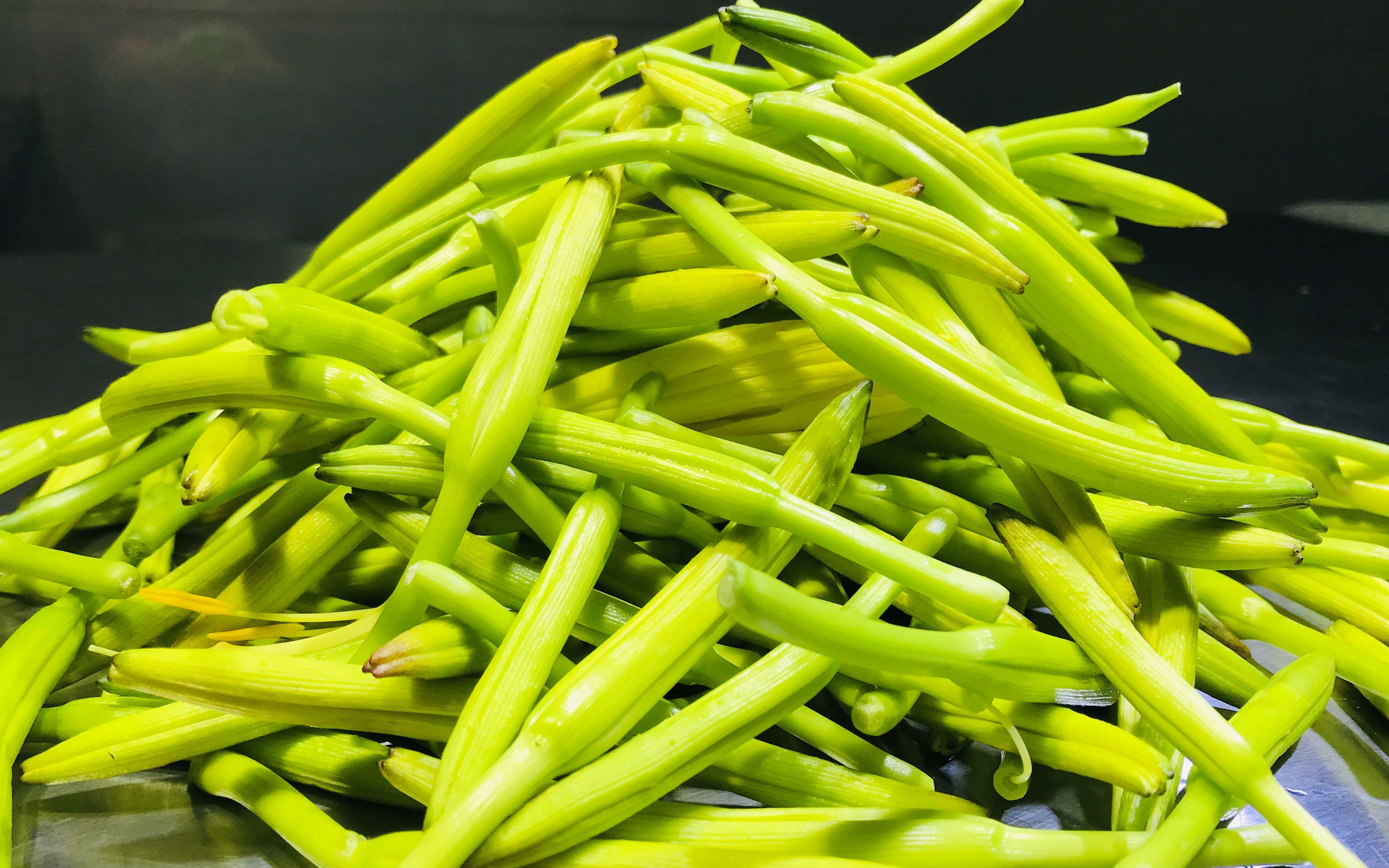鮮黃花菜形狀細長,又叫“金針菜”,成熟於秋季,花瓣淡黃色,營養豐富,被譽爲“四大素山珍”之一,味鮮質嫩。