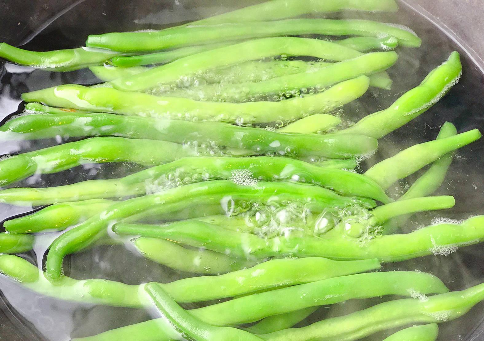 2四季豆清洗,放進鍋裏用熱水焯水,煮一會,撈起,過涼水