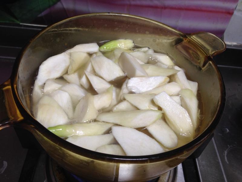2燉鍋里加入溫水, 放進排骨,加入薑片, 大火來煮