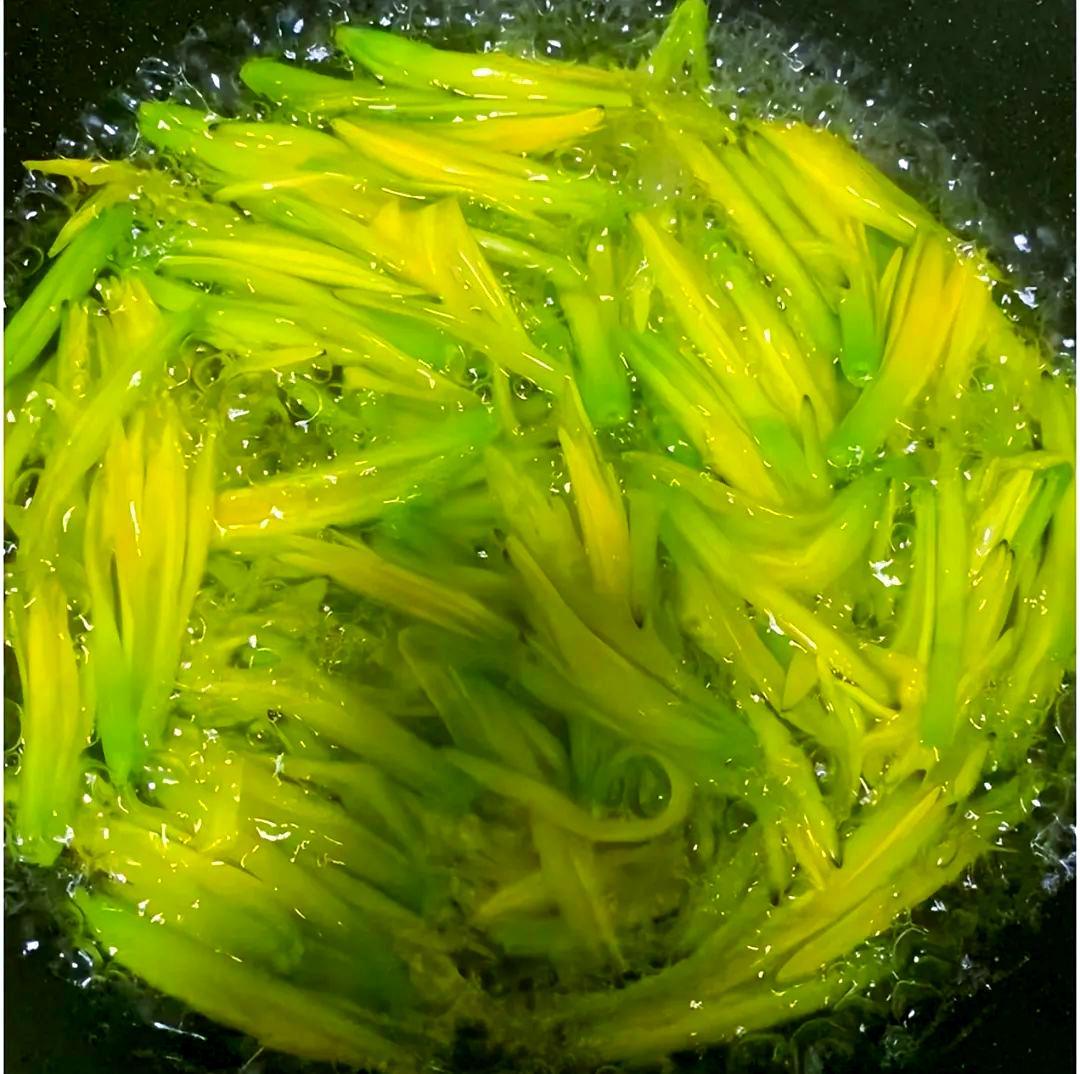 3新鮮黃花菜清洗, 放進熱水裏焯水, 撈起, 瀝乾水分