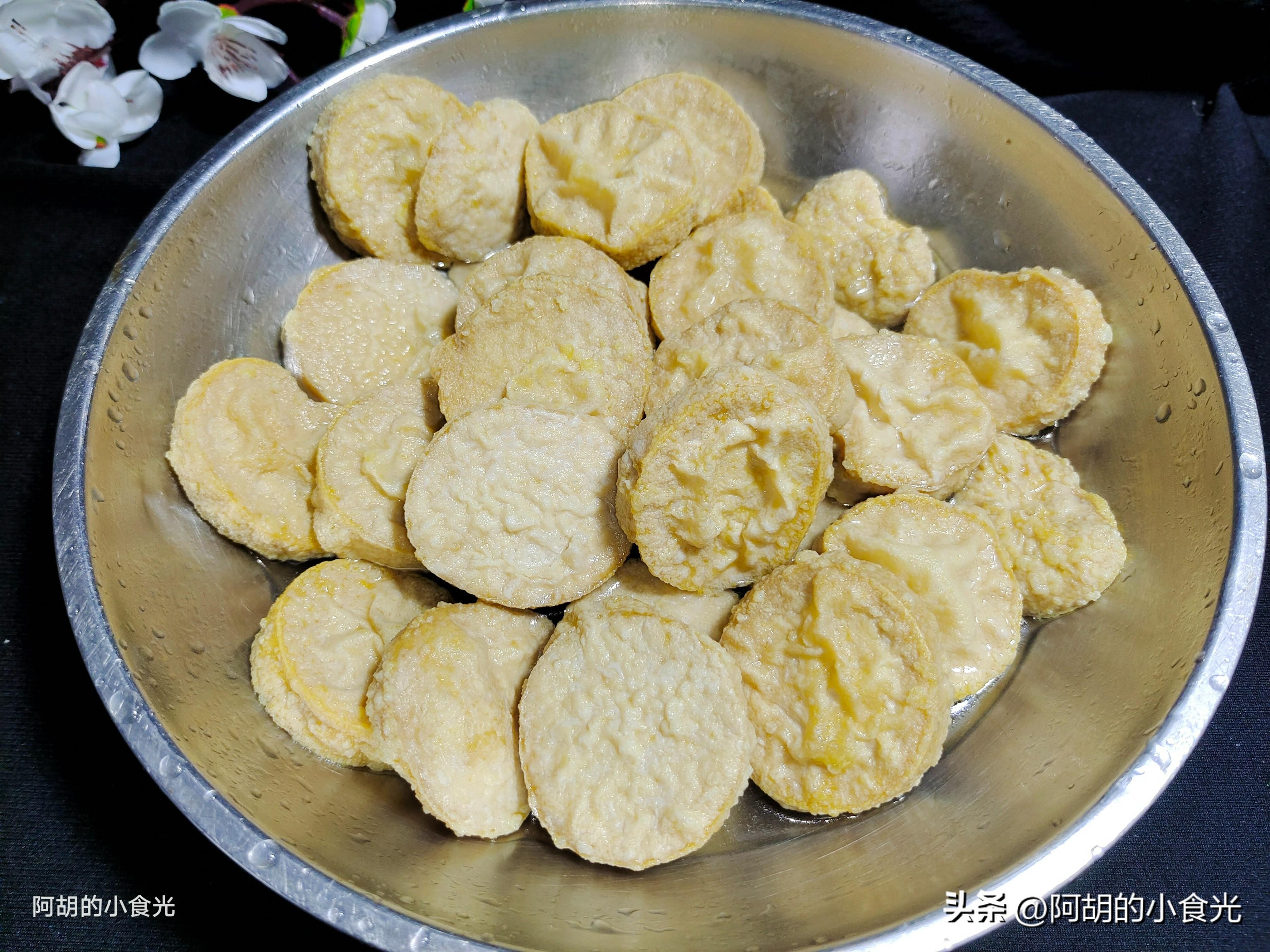 第二步:這個素雞撈出後要及時投入涼水中泡一泡,主要是要將其外泡軟,後面再煮的時候更容易吸收湯汁。而且用清水衝一衝可以幫助去除一些殘留的油脂。沖洗好後還要擠一擠水分,注意不要太用力擠,防止素雞被擠破。