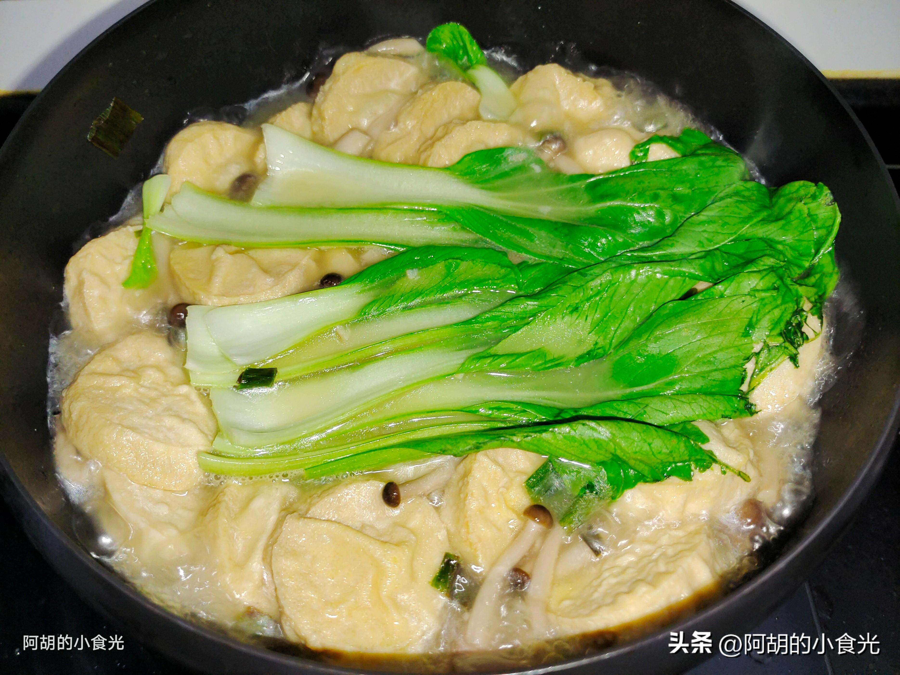 第六步:燉煮的過程中不要胡亂攪拌,防止把煮軟的素雞外皮捅破,最後把青菜下鍋燙熟,再品一品湯汁的味道,略作一些調整,而後就可以出鍋裝盤了。很是鮮軟開胃的一道菜,軟嫩的素雞吸收了鹹肉蘑菇的湯汁更是有滋有味,一口咬下去滿口都是湯汁,太開胃太下飯了,值得各位試一試。