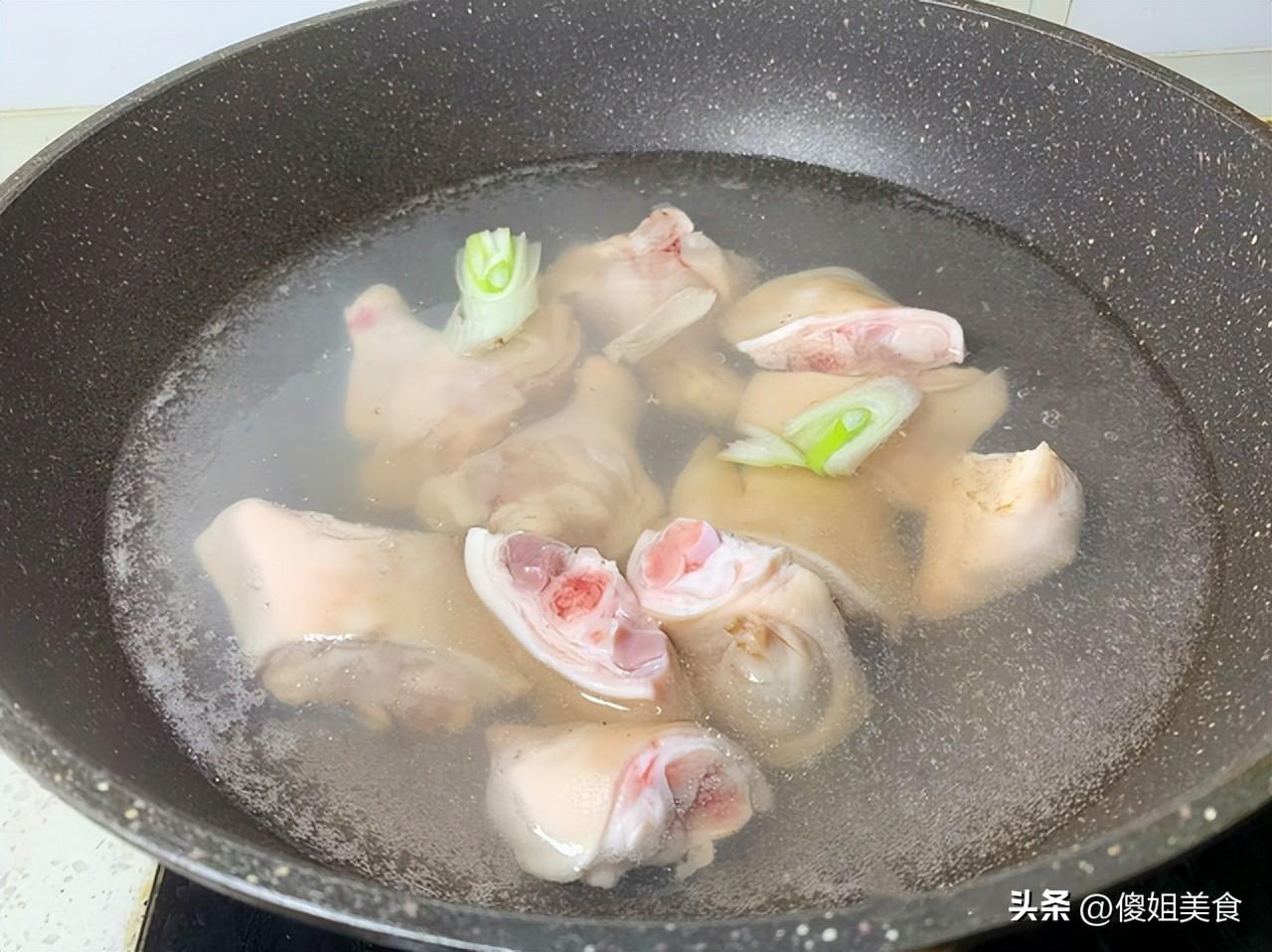 2、把豬蹄塊和雞腿塊冷水下鍋,放入幾片生薑,倒點料酒,開大火煮開,這時候會浮起來很多血沫,用勺子把這些沫子撇乾淨。焯水不僅能去除腥味,還能讓做出來的豬蹄更加乾淨清爽。焯好之後撈出來,用溫水沖洗乾淨,瀝乾水分備用。