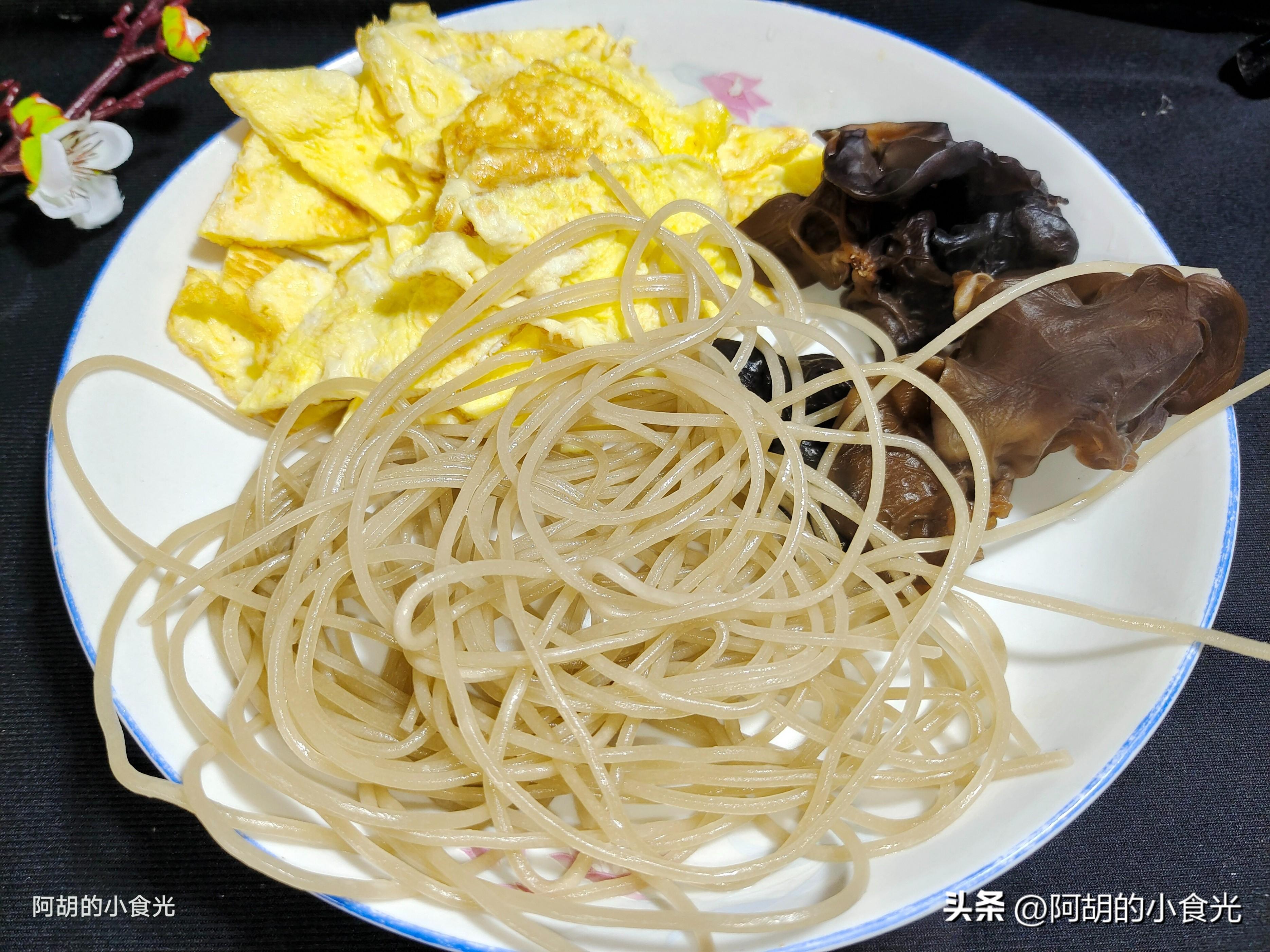 第二步:其它的配菜需要準備一把小青菜,清洗乾淨後瀝乾水分待用。一把紅薯粉條用溫水泡軟後待用。少許的幹木耳用涼水充分泡軟後備用。還有兩個雞蛋攤成的雞蛋皮切成菱形片備用。在攤雞蛋皮的時候最好往蛋液中加入一些澱粉水,如此可以讓雞蛋皮更有一些韌性,不容易破碎。