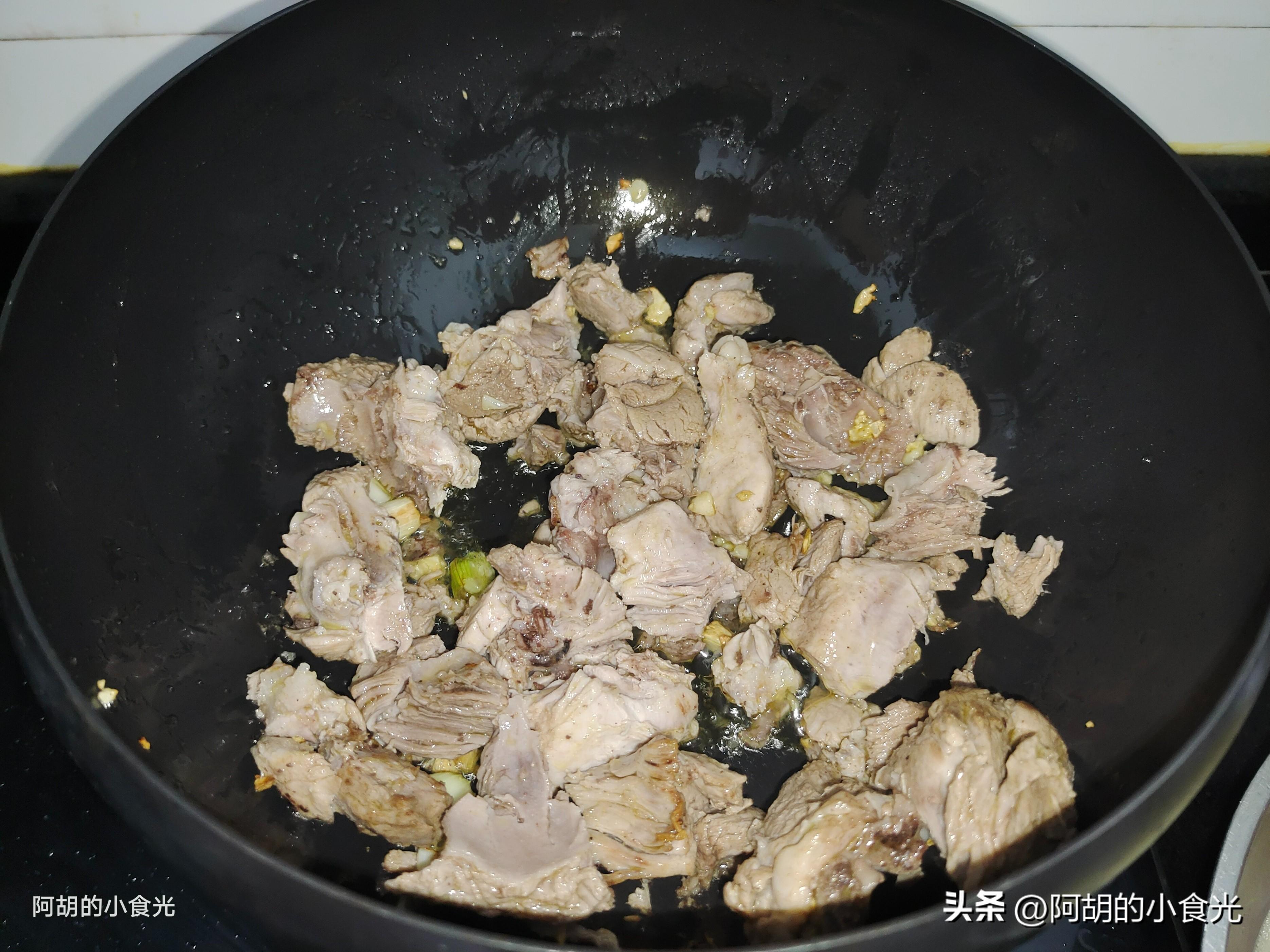 第三步:所有的食材基本都準備好,下面就可以進入烹飪主題。鍋小火烘乾後淋入一些菜籽油燒熱,下入小料蔥蒜炒出香味,此處喜歡辣味的可以適當添入一些幹椒節一塊炒一炒。把拆骨肉直接倒入鍋中,轉爲大火炒一炒。
