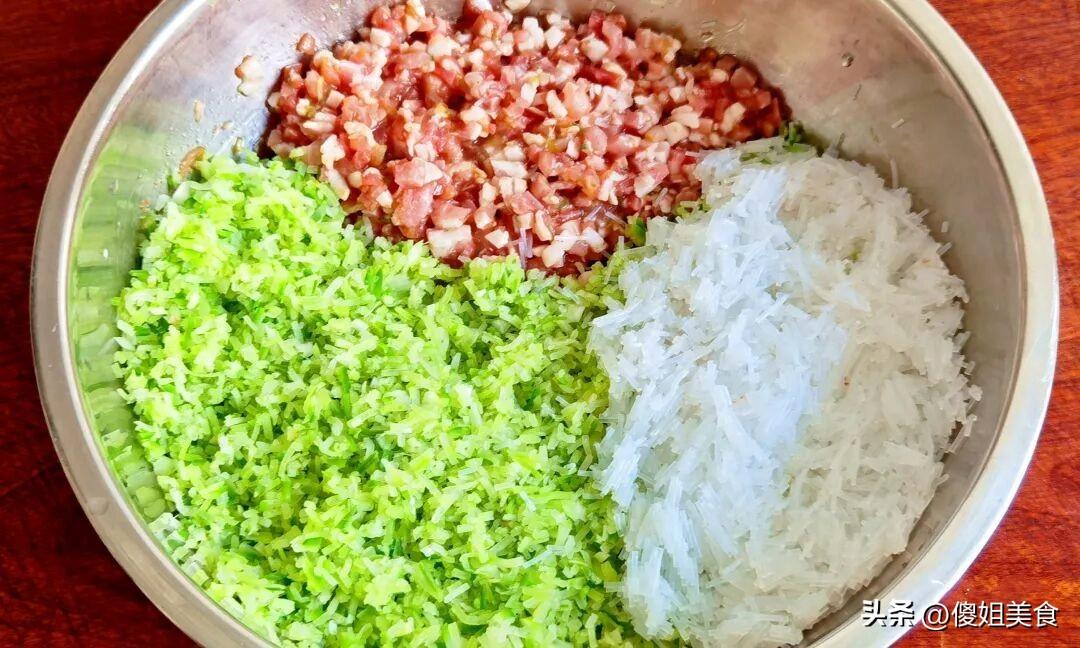 接下來就是調餡了,把攥幹蘿蔔絲、粉絲和肉餡放在一個大盆裏,加入蔥薑末,這蔥薑末可別省,去腥增香就靠它了。