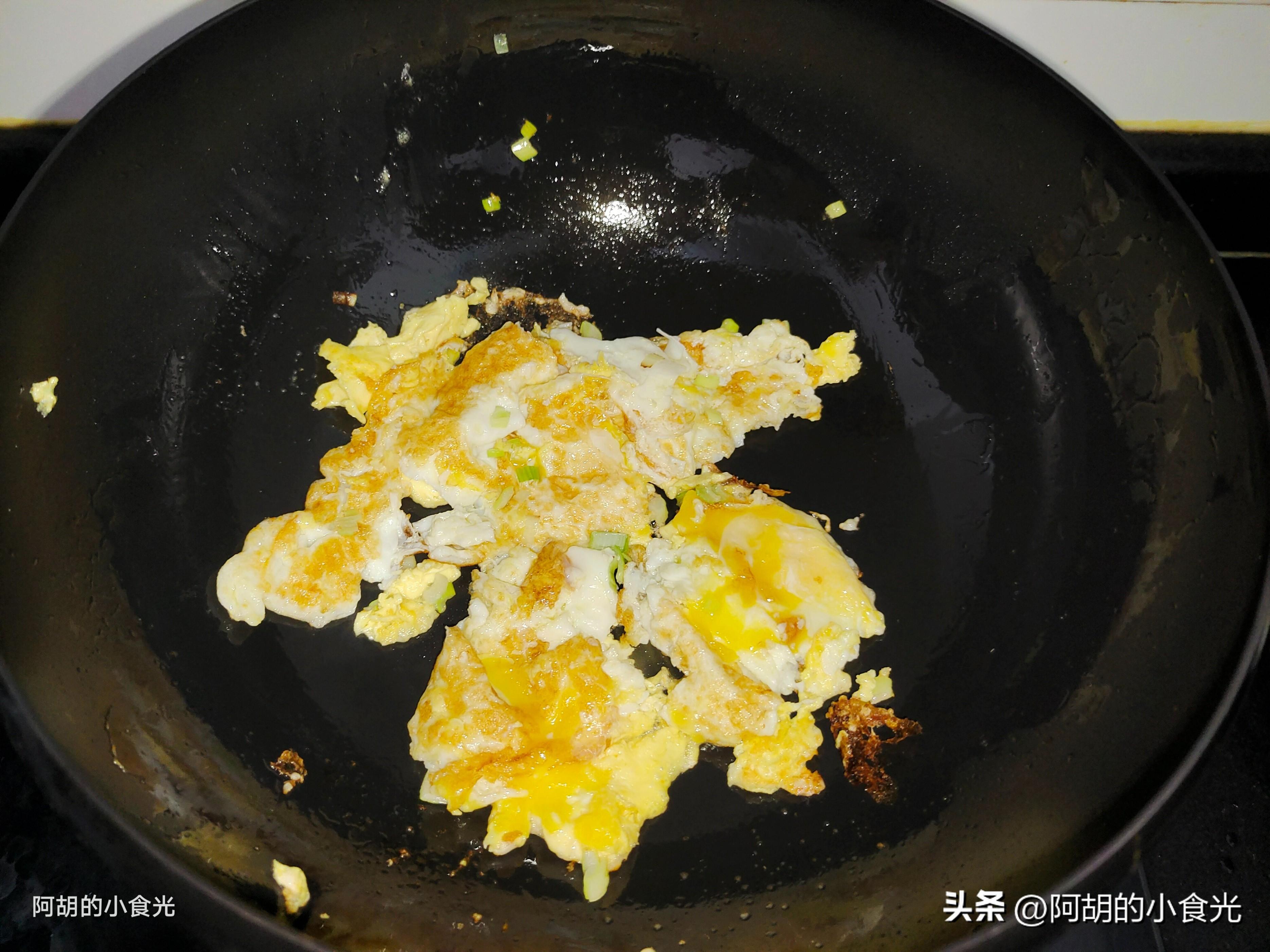 第三步:基本需要提前準備和處理的食材都備好,下面就來開火燒湯。先把鍋烘乾,淋入一些花生油燒熱,直接打入兩個雞蛋煎一煎,把其煎成荷包蛋,而後再用勺子切開成大塊,再撒入一把蔥花炒一炒,炒出鮮香味。