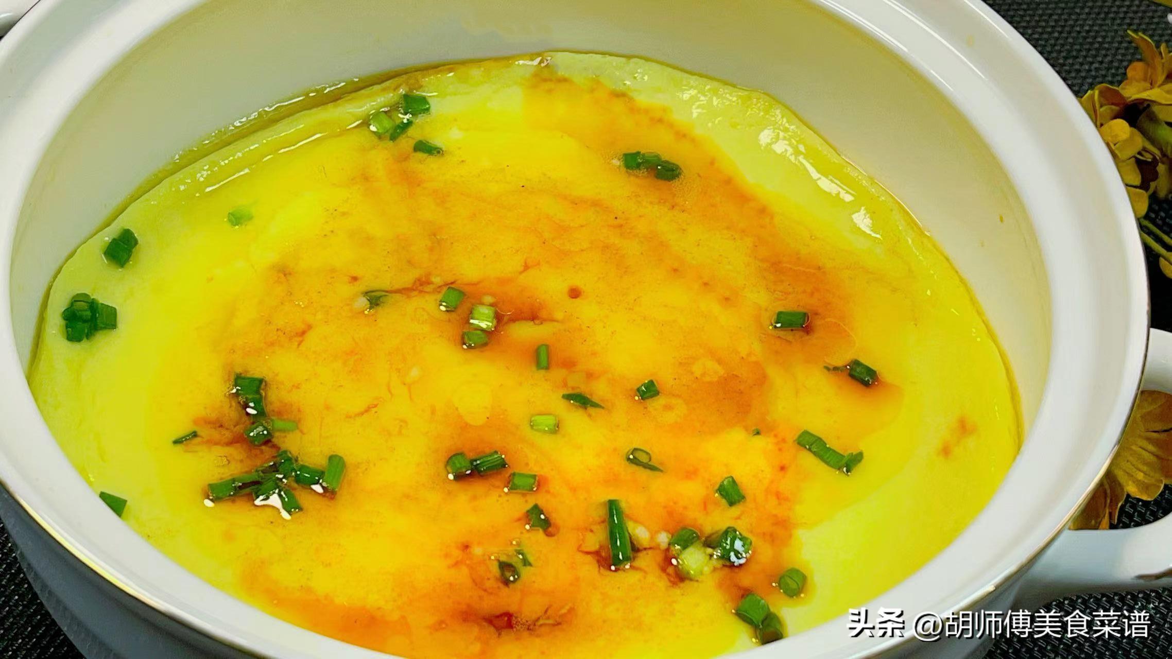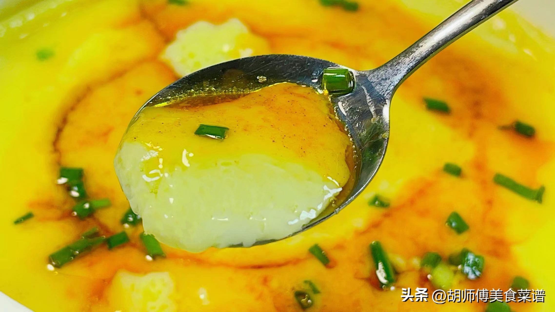 4.接着再把準備的生抽、蔥花撒到雞蛋羹上,最後淋上一勺熱油即可食用。