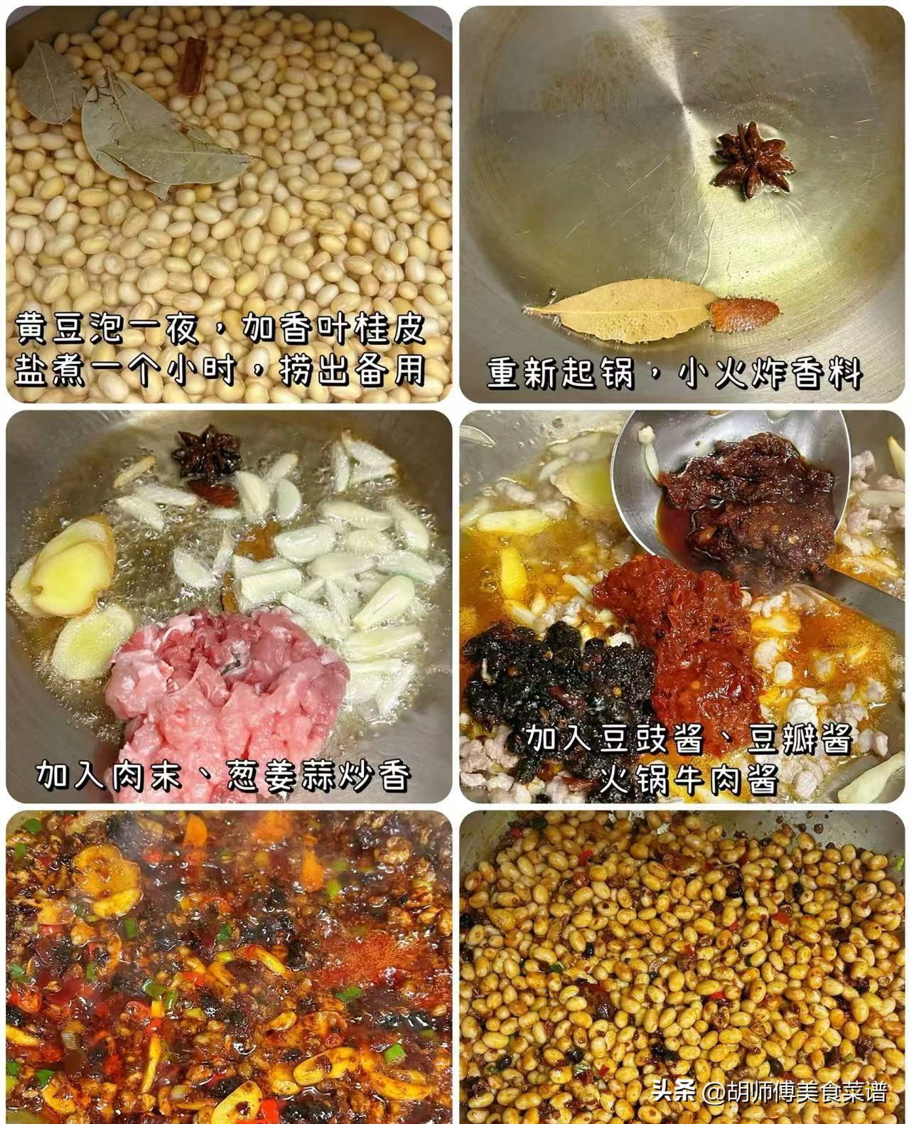【食材準備】:黃豆500克、瘦肉100克、豆豉醬30克、豆瓣醬30克、牛肉醬30克、八角2克、香葉2克、桂皮2克、食鹽、白砂糖、食用油適量。