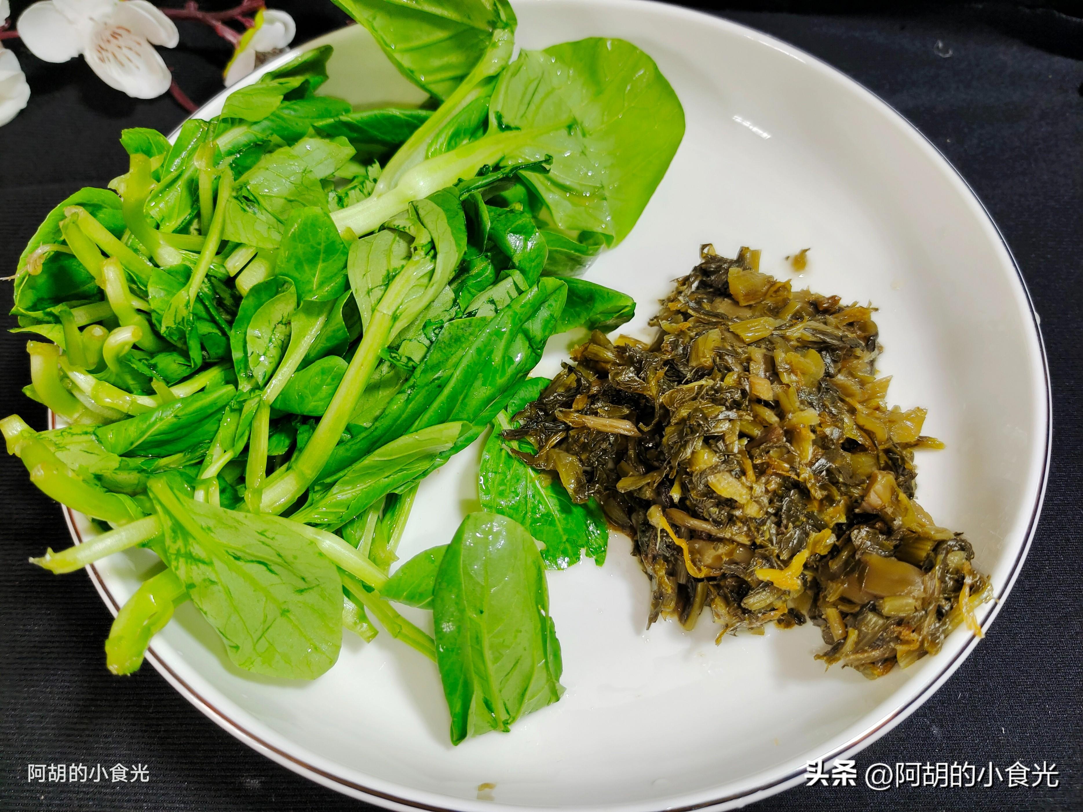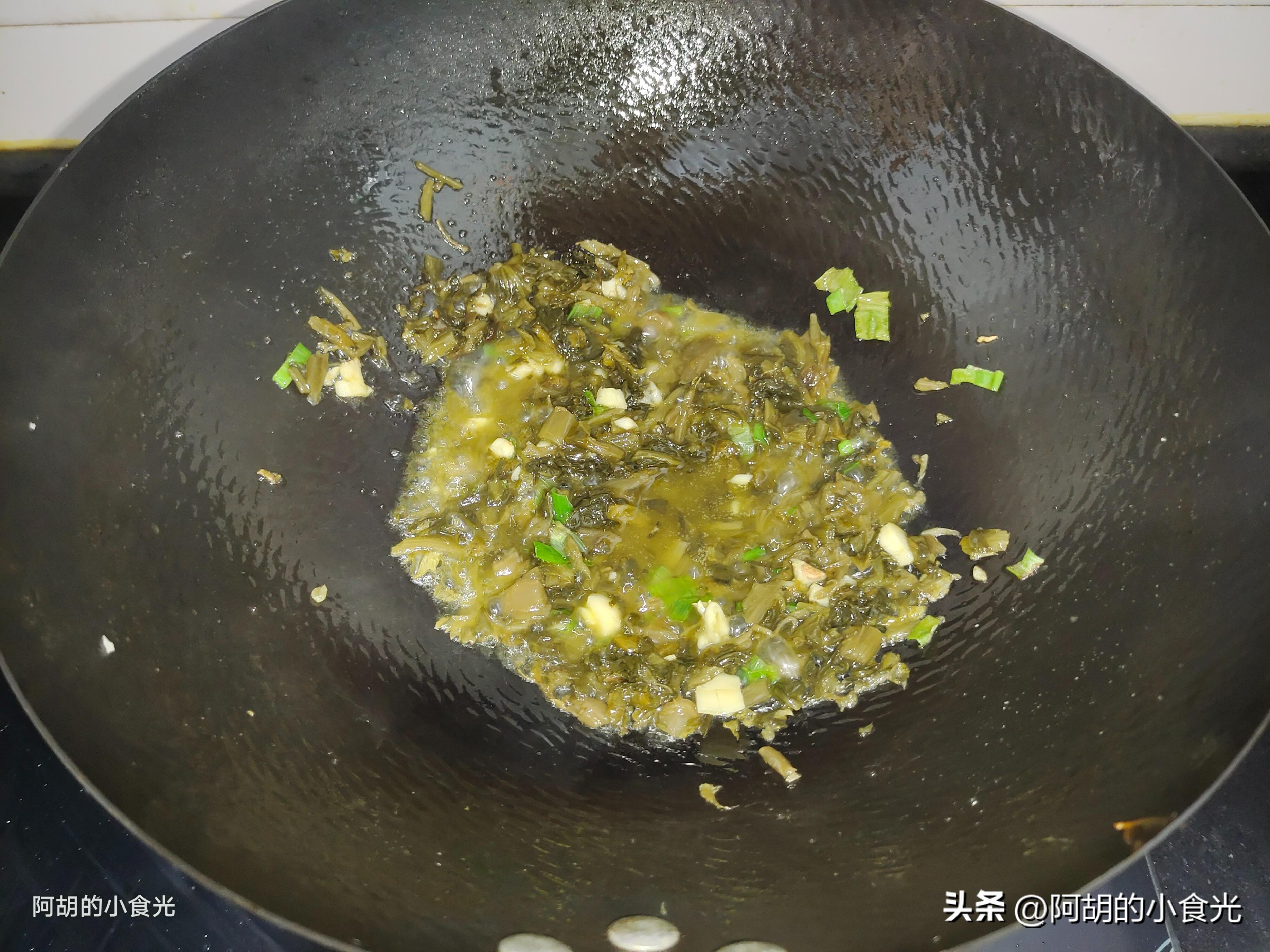 第四步:所有食材都處理和準備好,下面就來開火烹飪。先把鍋烘乾,淋入一些菜籽油燒熱,加入小料蔥蒜炒出香味,接着把雪菜倒入鍋中炒一炒,炒出雪菜的香味,再衝入開水適量。