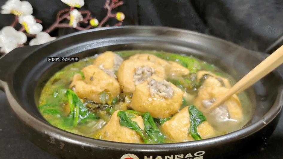 這道菜叫做“雪菜油豆腐塞肉”,主要的食材有4樣,有油豆腐、肉末、雪菜和青菜,其中這個油豆腐和肉末是結合在一塊的“油豆腐塞肉”,將其用雪菜和青菜燉成一道湯菜,油豆腐吸收了湯汁,更是有滋有味,上桌一定要換大碗盛飯喫才過癮。