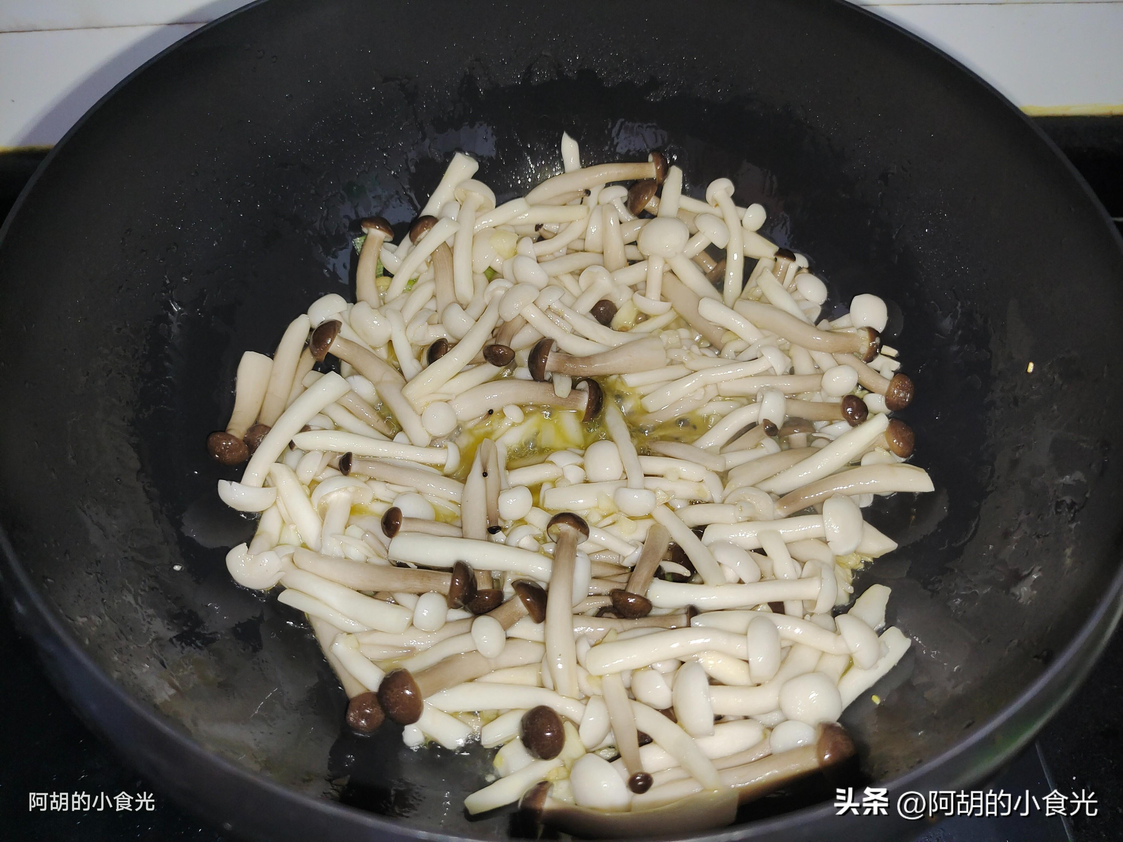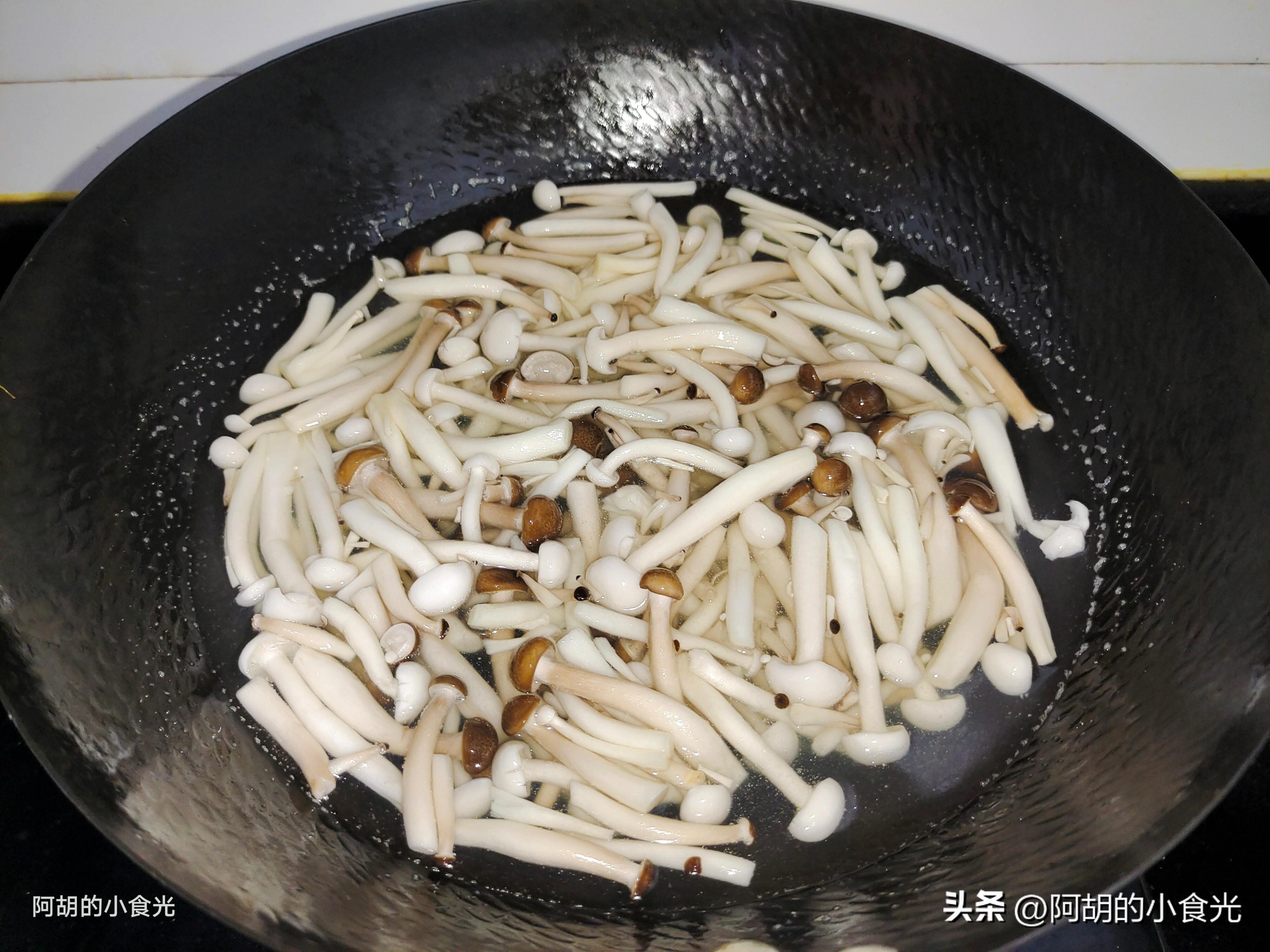 第一步:先來準備兩種蘑菇,其實蘑菇的品種不固定,你也可以按需搭配鮮香菇、口蘑、草菇等,今天我用的是白玉菇和蟹味菇,把這兩種蘑菇的根部切掉,而後放入清水中淘洗乾淨。而後開水下鍋,將這兩種蘑菇進行焯水一分鐘,撈出後置於一邊控幹水分待用。