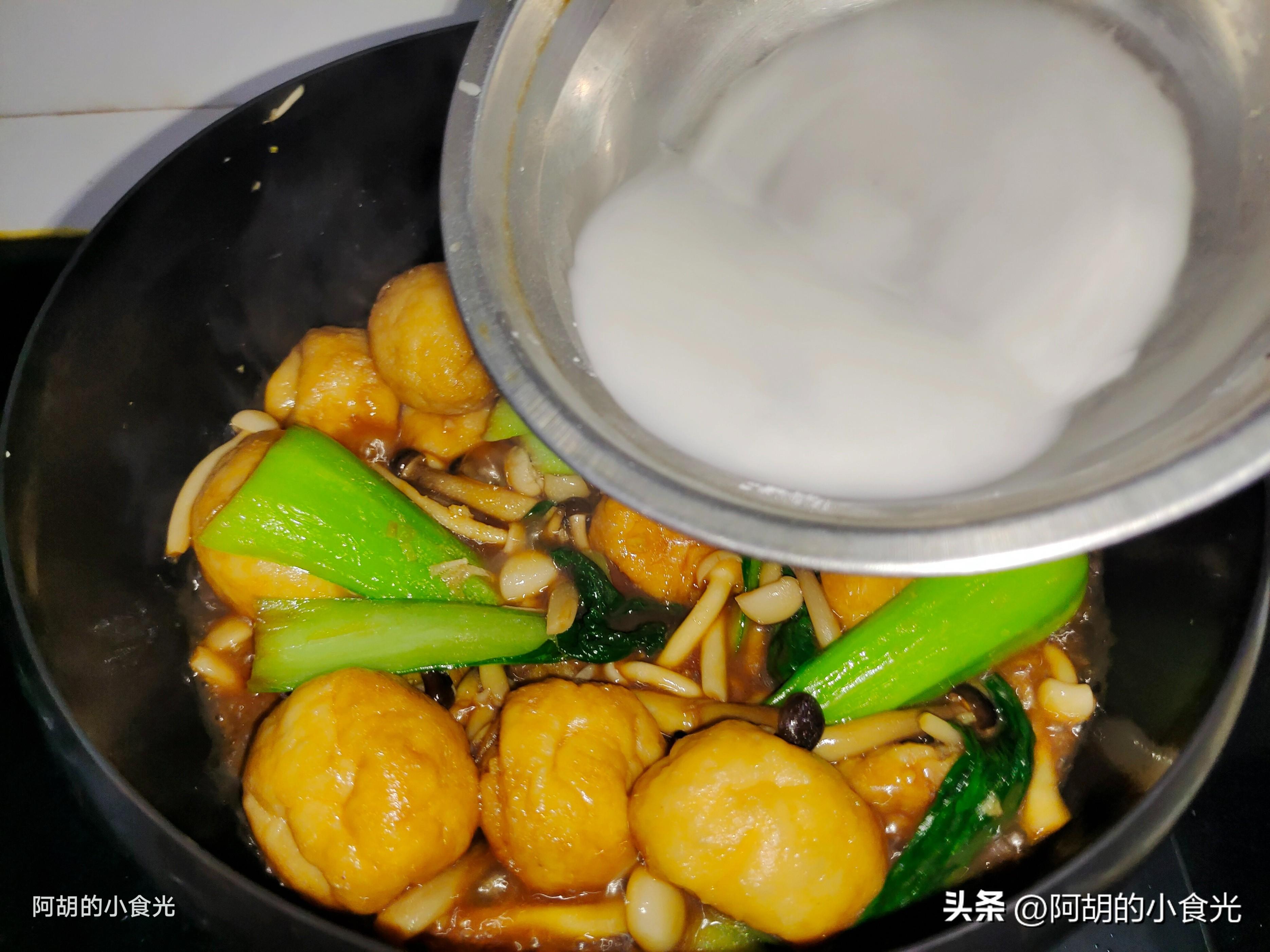 第六步:時間到後,鍋內還有很多湯汁,此時用涼水稀釋一些澱粉,攪勻後直接淋入鍋中,同時大火翻炒讓湯汁濃稠起來,可以掛在食材表面的程度即可,喜歡的在最後也可以淋入一些芝麻油就可以出鍋裝盤了。這一盤都是鮮嫩的口感,口味鹹香微甜,特別的開胃下飯,想喫的不妨快動手試一試。