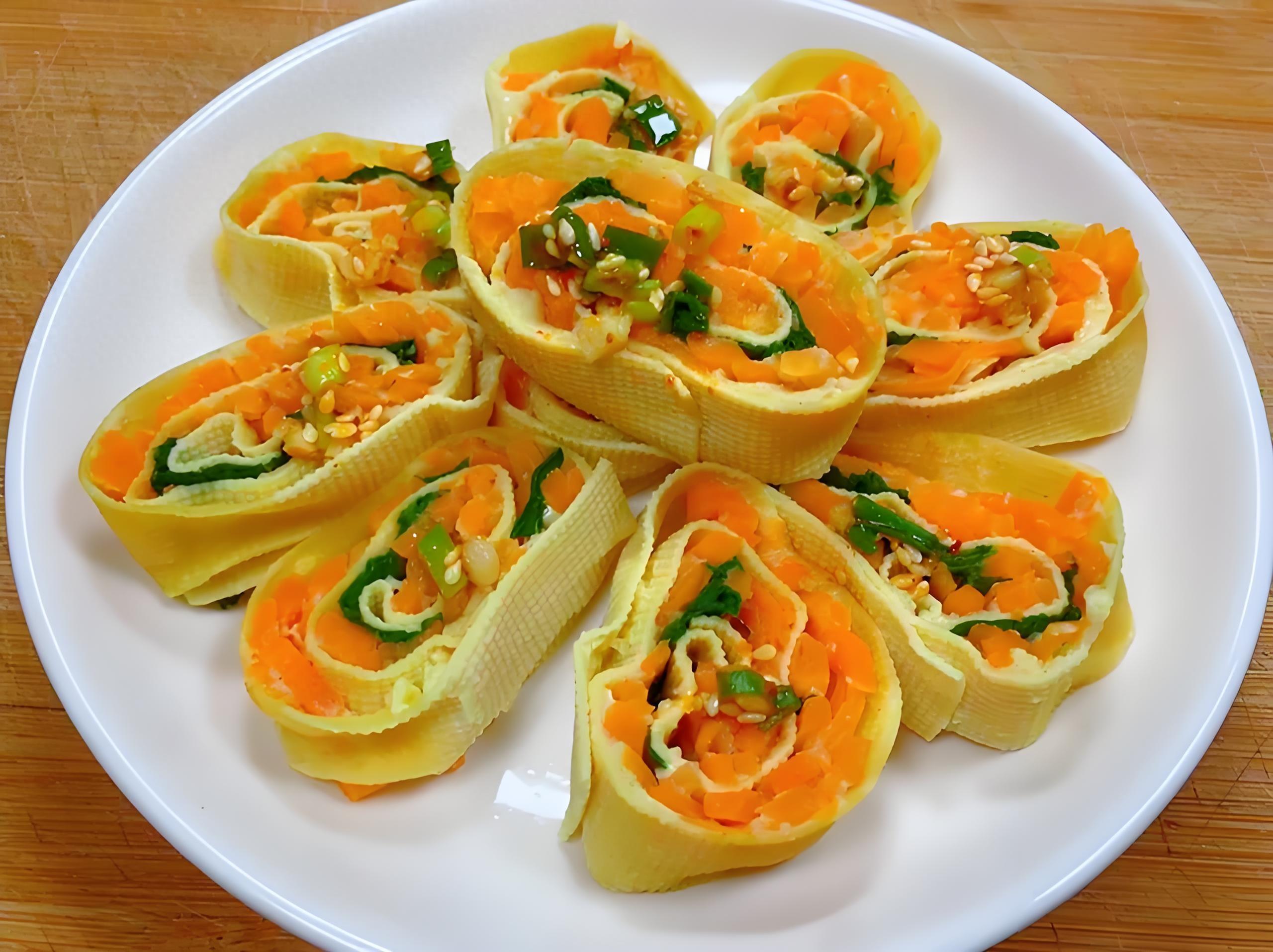 1. 準備幾張豆腐皮,切成寬條。抓一小把金針菇,用豆腐皮條把金針菇捲起來,然後在末尾打個結,像繫繩子一樣,這樣一個生坯就做好了。