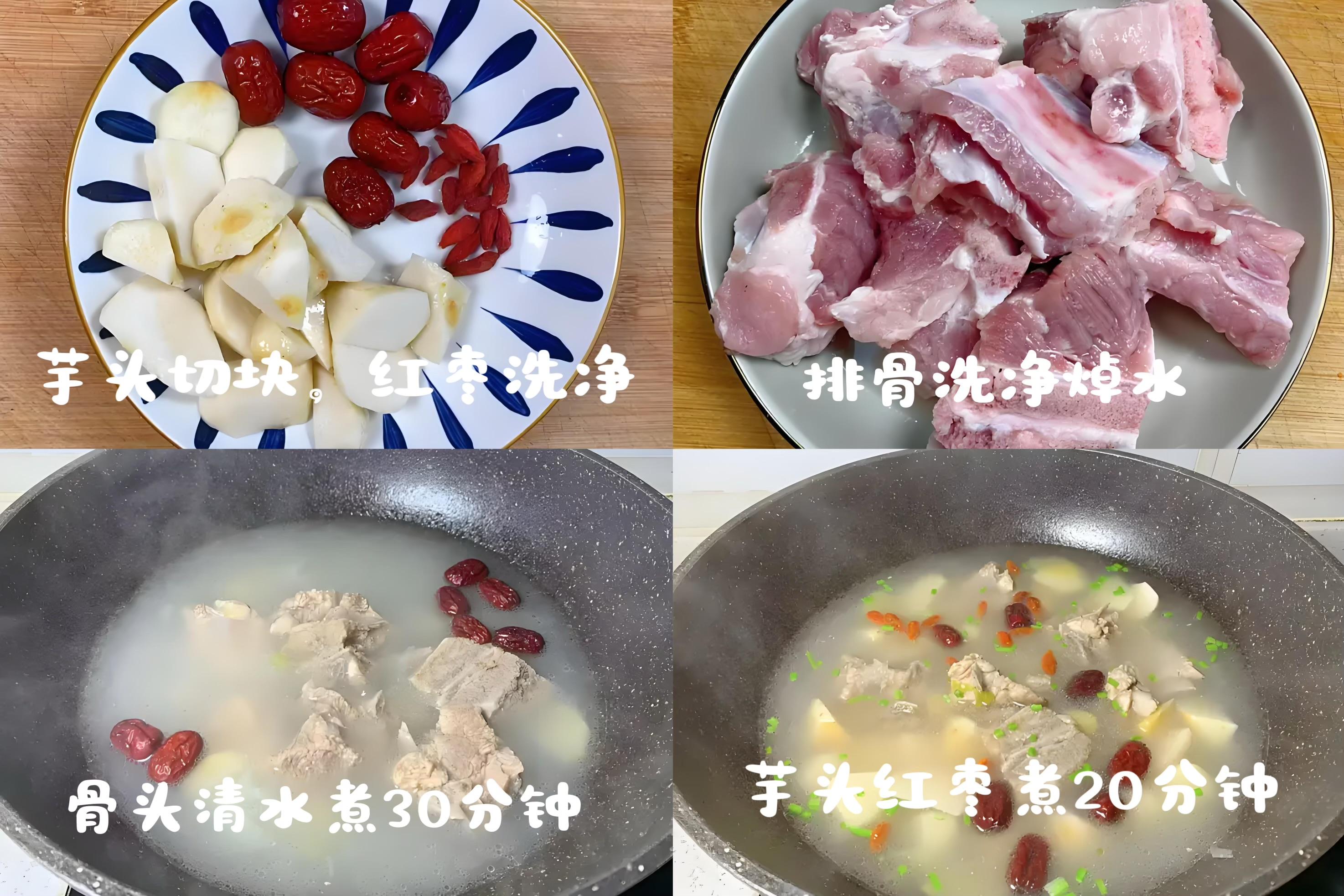 這道湯水堪稱“養骨黃金湯”,排骨提供營養和鮮味,芋頭健脾,紅棗枸杞補氣血,溫溫熱熱喝一碗,從頭暖到腳。