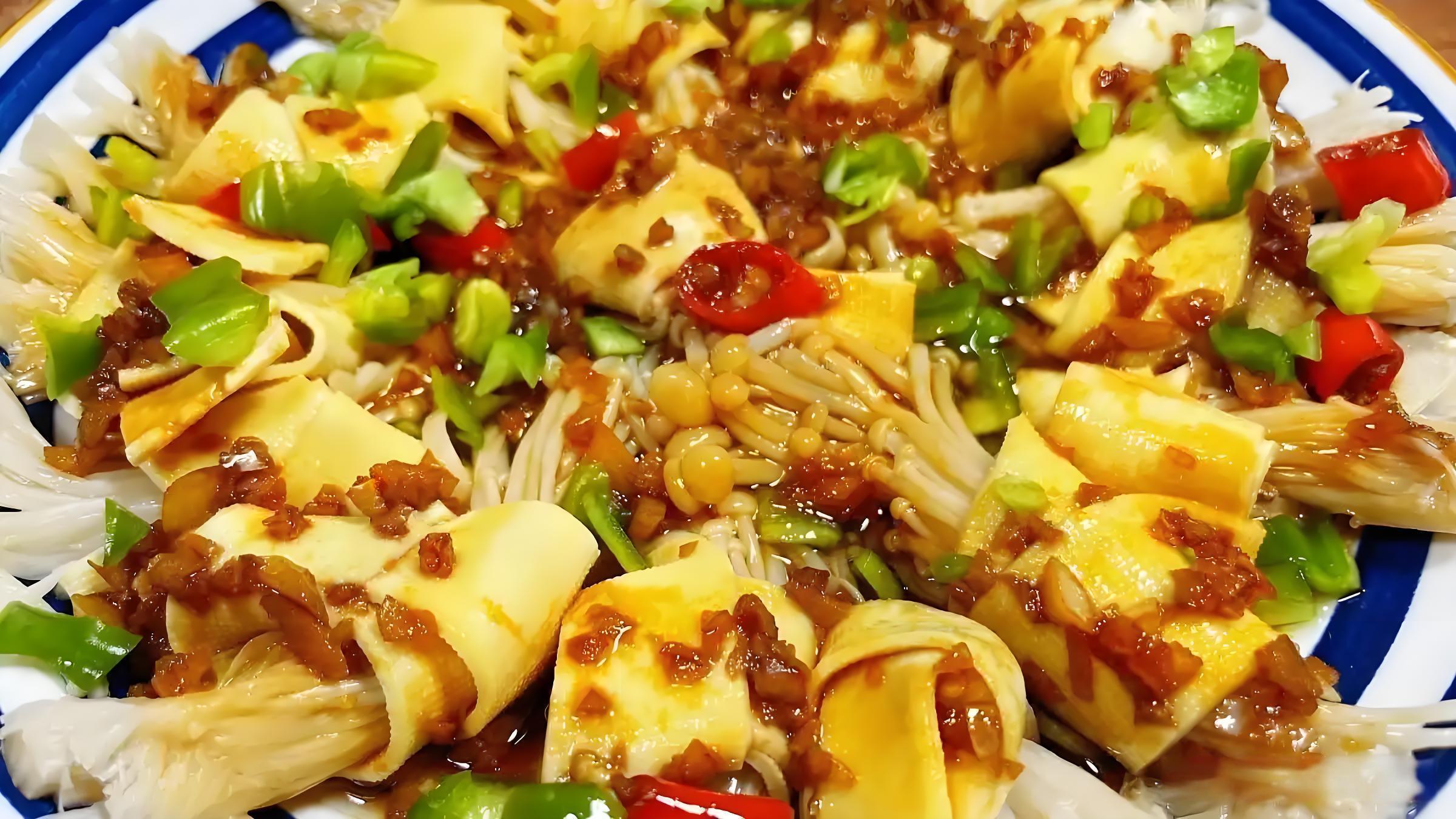 這道菜做法簡單,味道卻一點不簡單,豆腐皮吸收了湯汁的鮮味,金針菇口感爽滑,營養又下飯。