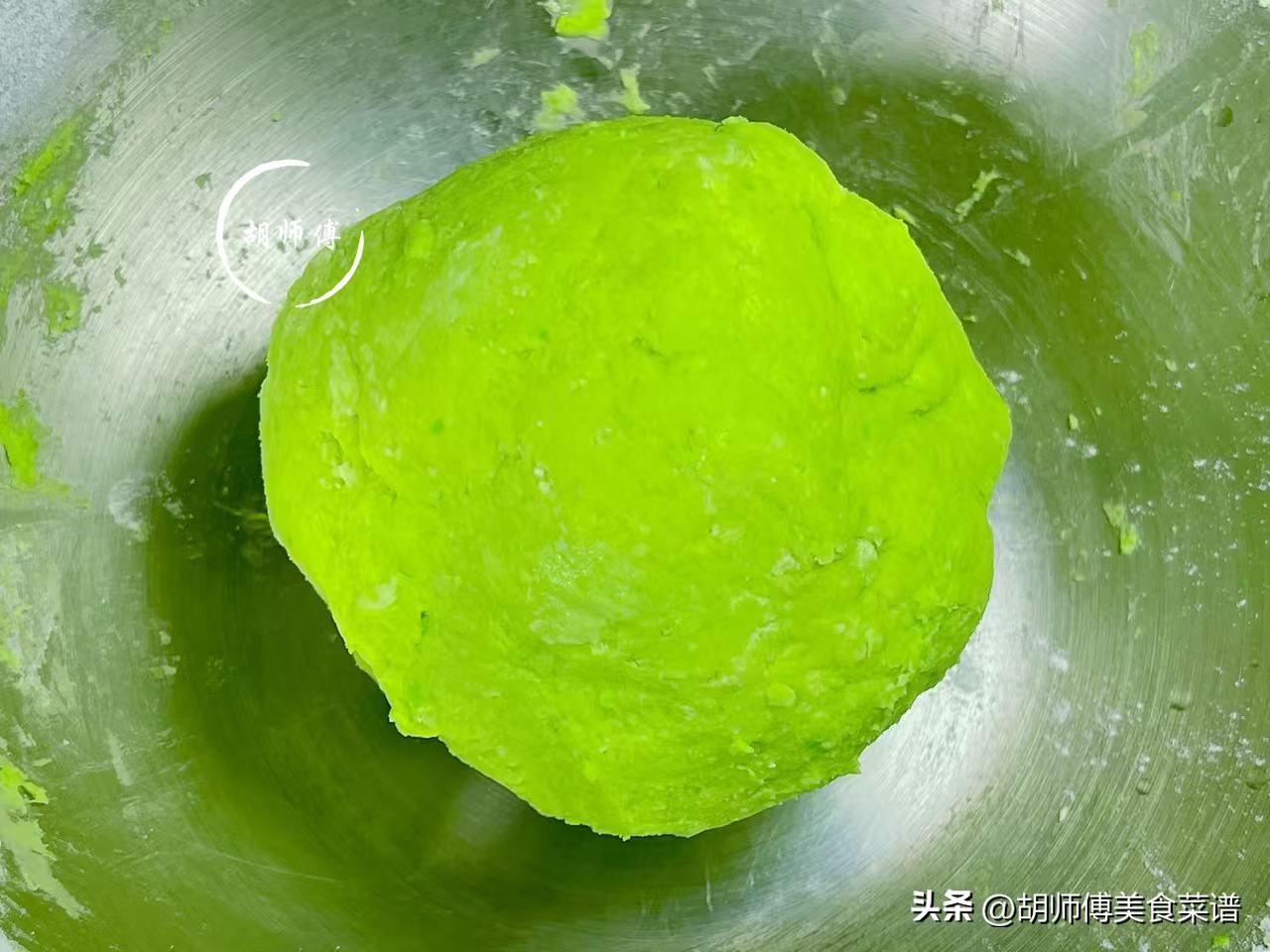 第四步:將毛豆米糊、麪粉、2克食鹽、1克小蘇打全部都放入盆中,然後將它們揉成光滑的麪糰後,接着用毛巾將面蓋住,醒面30分鐘,這樣可以使面變得更鬆軟。