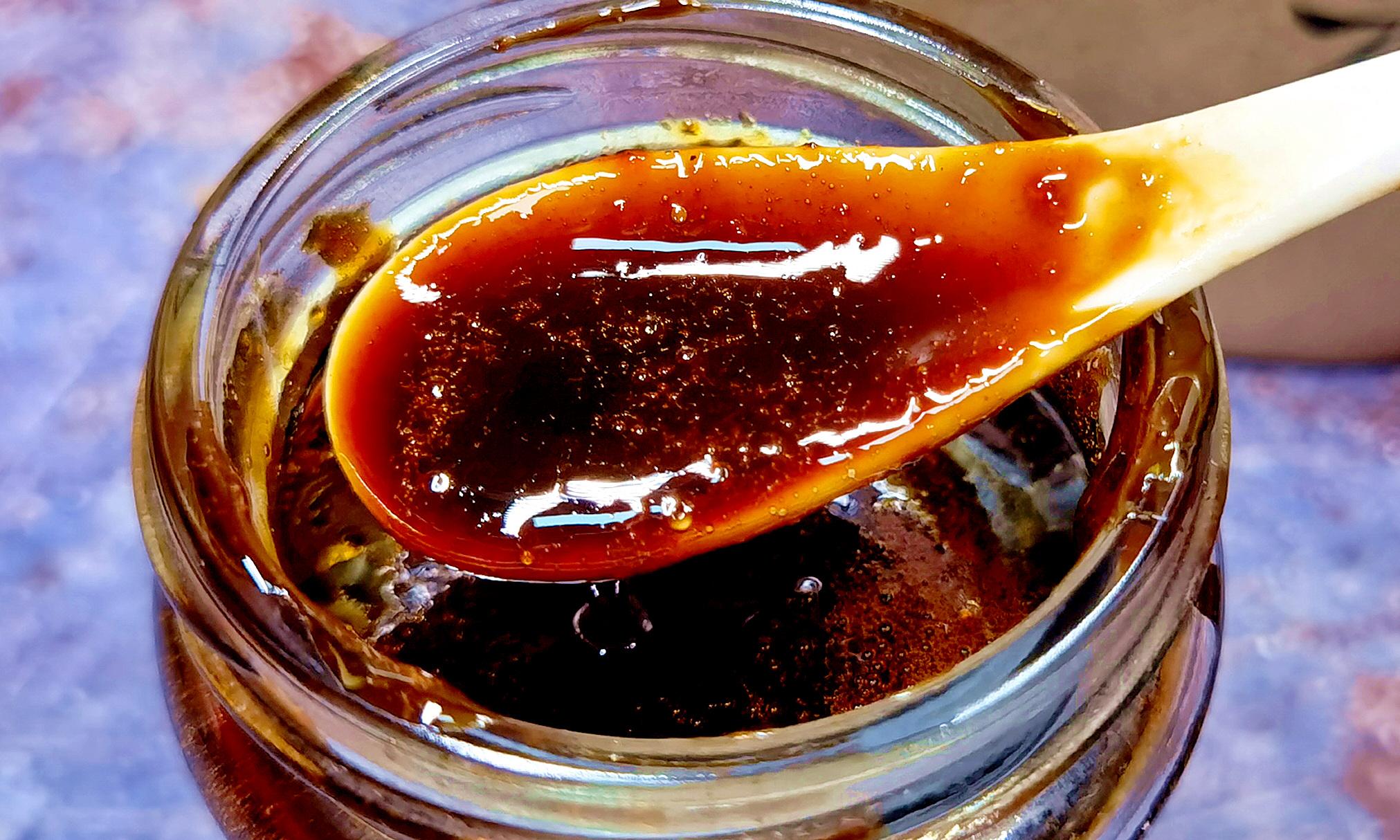 3. 期間要不停攪拌,防止粘鍋,直到熬成粘稠的、晶瑩剔透的醬狀。放至完全冷卻後,倒入足量的蜂蜜攪拌均勻,裝瓶冷藏即可。