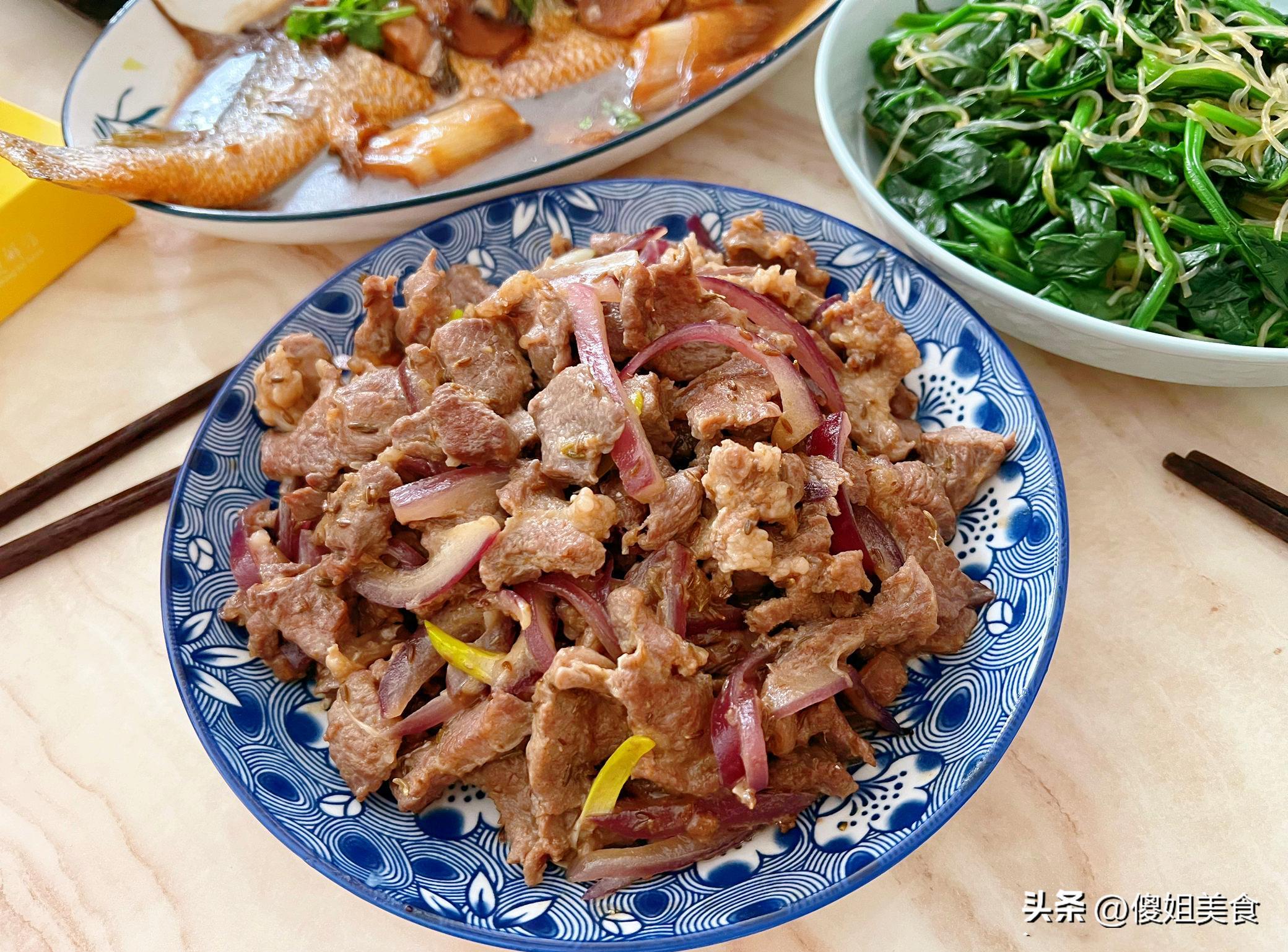 洋蔥拌牛肉更是老媽的最愛。媳婦選用牛腱子肉,先用水浸泡兩小時去血水,然後放入鍋中,加入八角、桂皮、香葉、蔥姜,小火慢煮一個半小時,煮好的牛肉放涼後切成薄片,與切好的洋蔥絲、香菜段一起,加入生抽、醋、香油、蒜末、少許糖和辣椒油拌勻。牛肉嫩而不柴,洋蔥清脆爽口,這道菜老媽特別喜歡,直說比飯店做的還好喫。