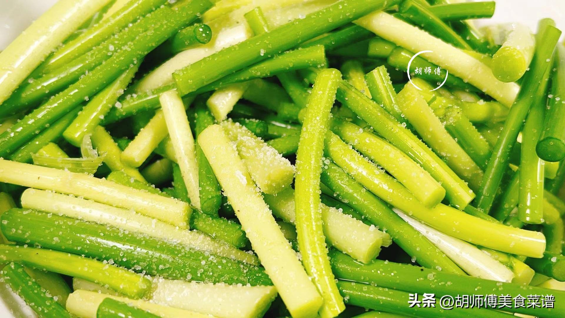第一步:將蒜薹掰成4-5釐米的小段,然後再用清水將蒜薹沖洗乾淨,接着撒上一點點食鹽在蒜薹中拌勻,大概將蒜薹醃製5分鐘即可備用。因爲蒜薹是比較難入味的蔬菜,提前醃製,可以使蒜薹喫着更入味。