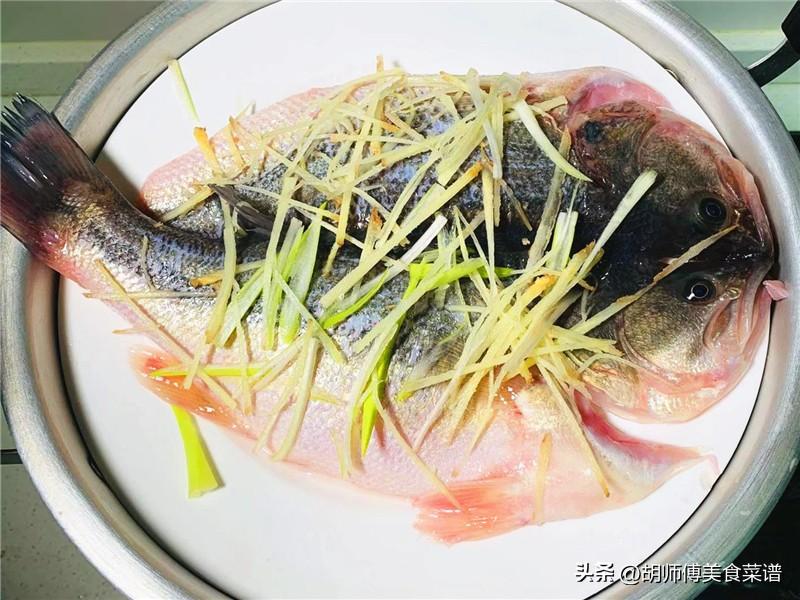 第二步:將瀝乾水的鱸魚放入蒸鍋中,然後撒上少許薑絲後,蓋上鍋蓋,大火將鱸魚蒸15分鐘即可關火,鱸魚不可以久蒸,否則會導致鱸魚喫着不鮮嫩。