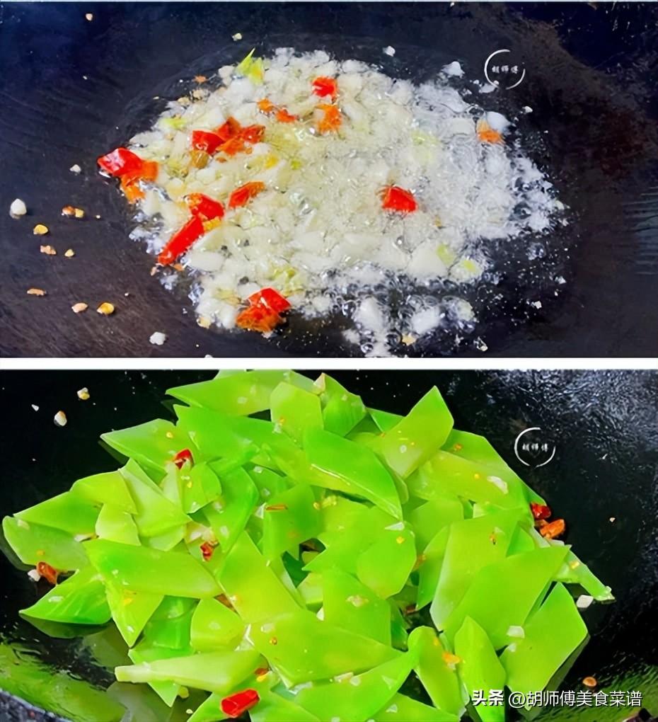 第三步:鍋中放入一勺油,等油燒熱後,將蒜末、小米椒放入鍋中爆香後,再把萵筍放入鍋中,大火將萵筍炒的斷生,再把少許食鹽放入鍋中炒勻。