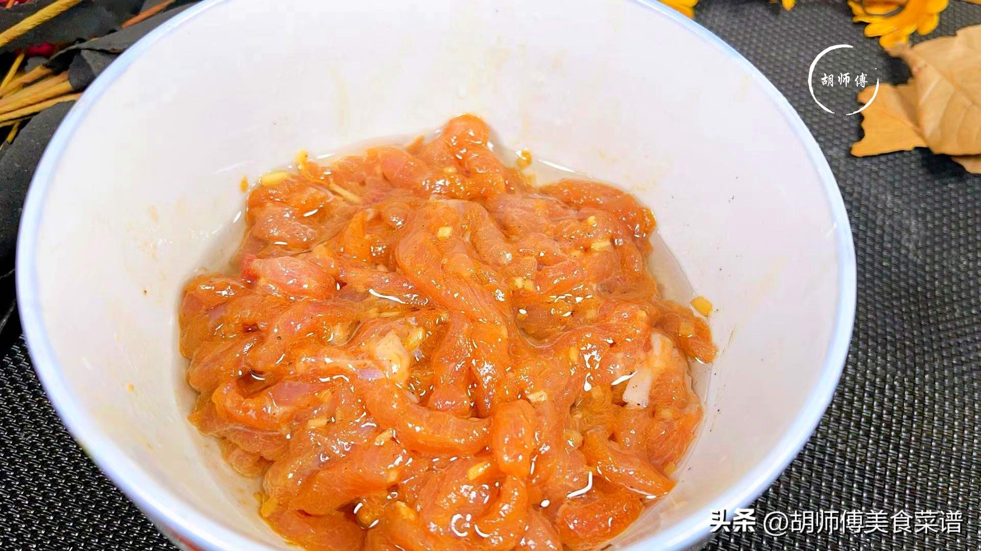 第二步:把瘦肉洗淨後切成細絲,然後將薑末、生抽、食鹽、胡椒粉、少許油放入肉絲中攪拌均勻。