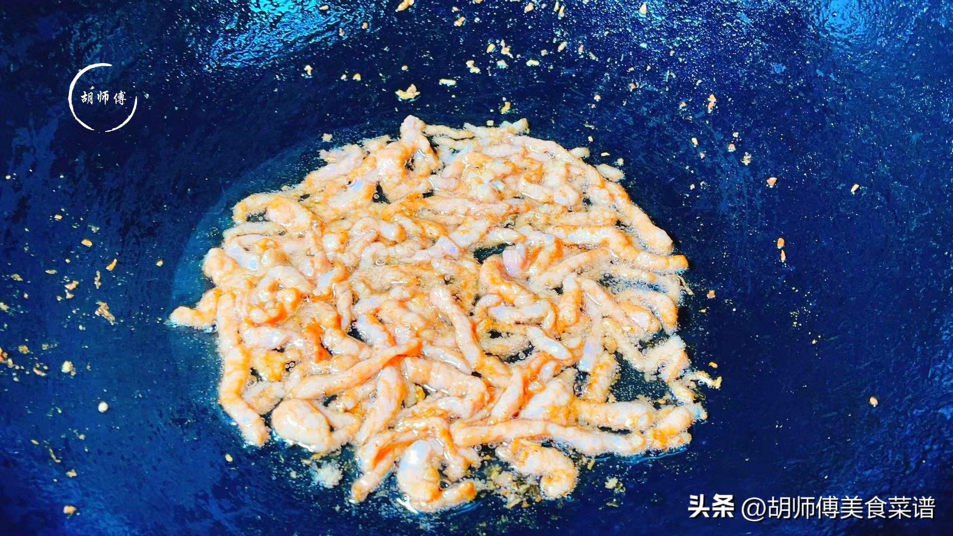 第三步:鍋燒熱後,把油放入鍋中,大火將油燒熱後,將瘦肉絲放入鍋中,大火將肉絲炒的斷生即可起鍋。