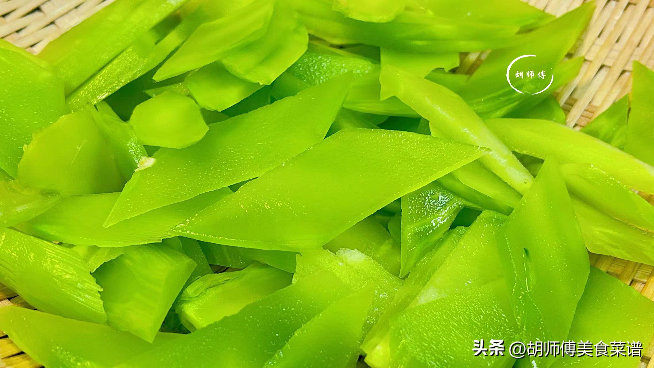 第二步:將萵筍削皮後洗淨,然後把萵筍切成0.3釐米厚的片狀備用。