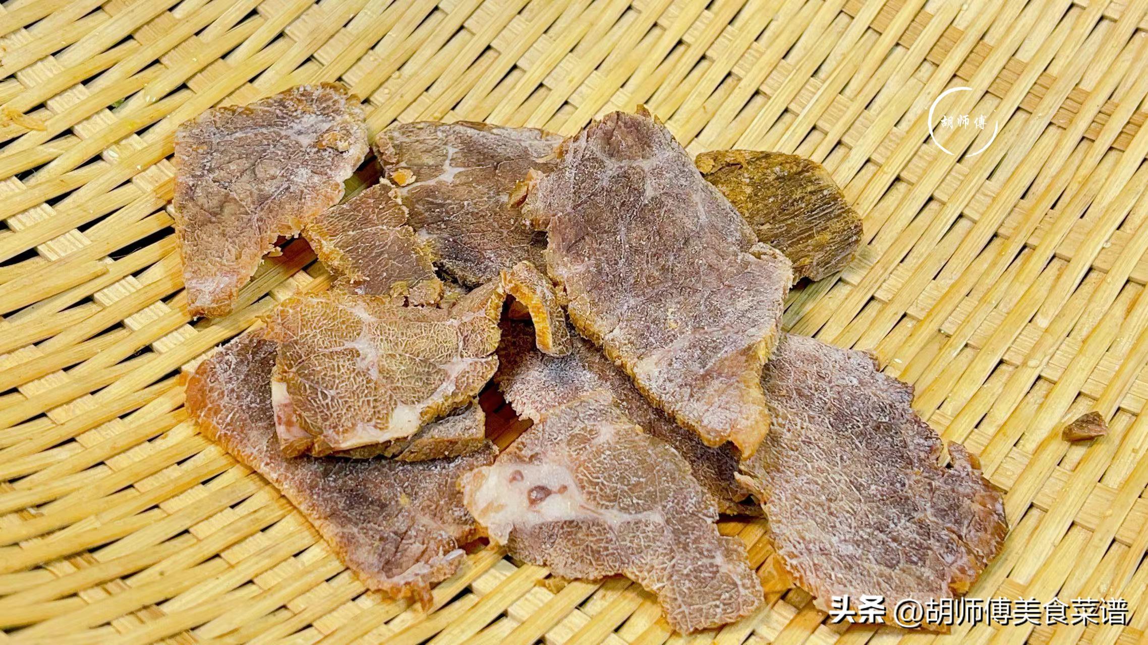 第一步:把醬牛肉切成0.3釐米厚的片狀,不要切的太薄,否則再炒的時候,很容易碎掉。