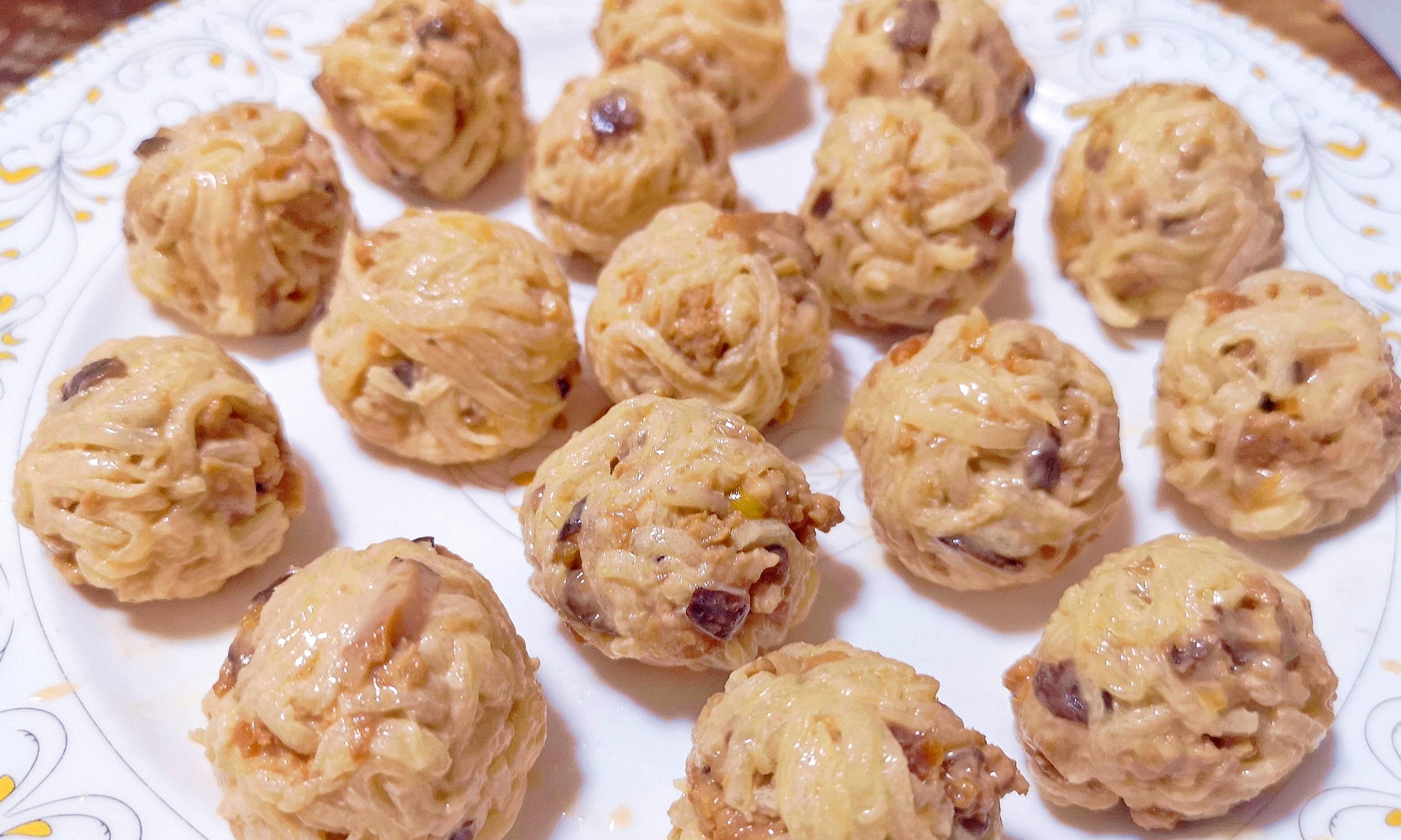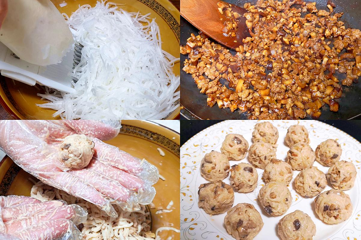 3. 把炒好的料和蘿蔔絲混合,加澱粉拌勻,團成丸子。